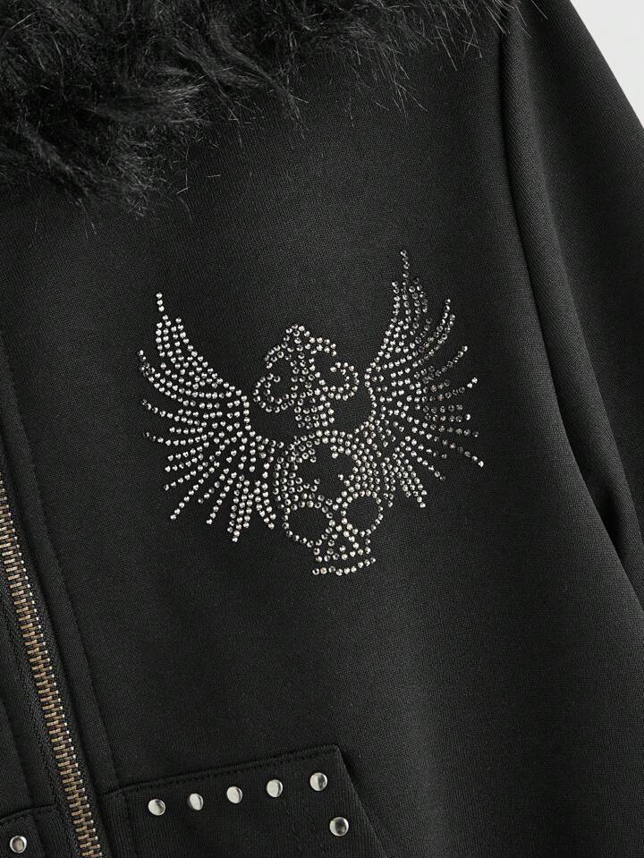 Sudadera con capucha cálida y térmica con estilo grunge punk, diseño de esqueleto con strass y remaches, y pelusa para mujeres