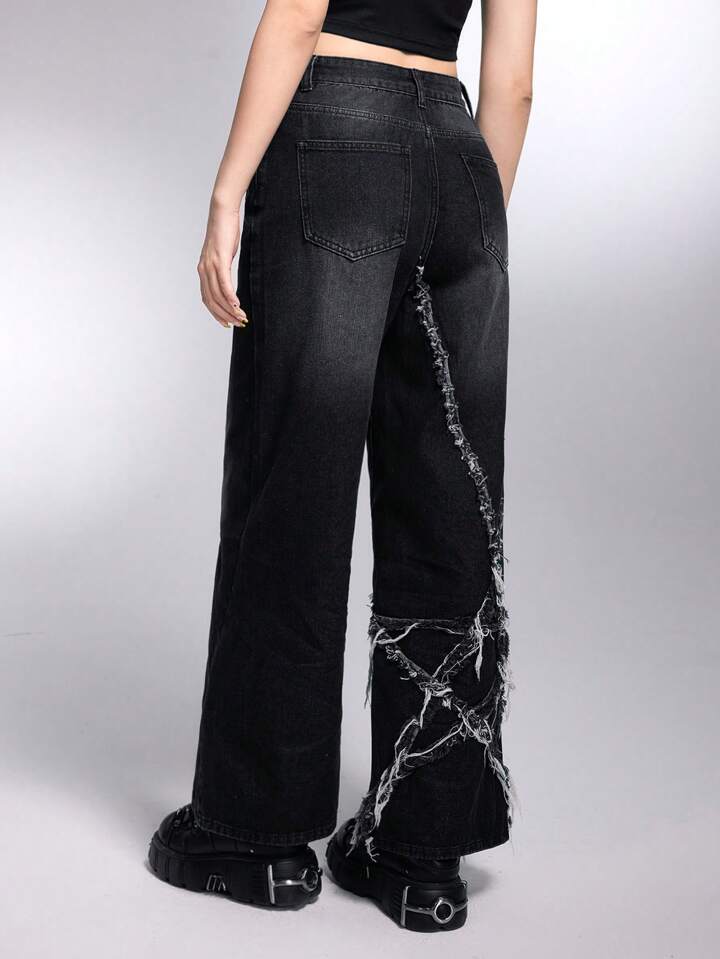 Grunge Punk Jeans Lavados De Pierna Recta Con Borde Sin Procesar Y Bolsillos Inclinados