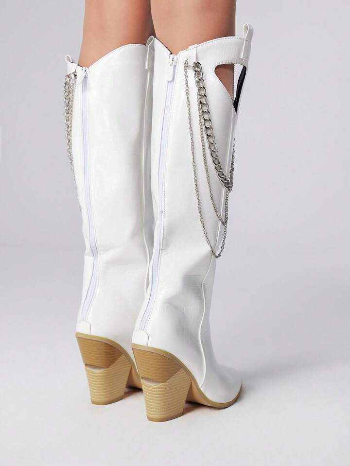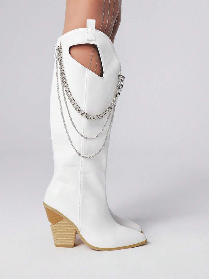 Grunge Punk Botas de media pantorrilla con decoración de cadena y relieve de cocodrilo blanco, botas altas de estilo punk con tacón grueso y hueco de moda para mujer