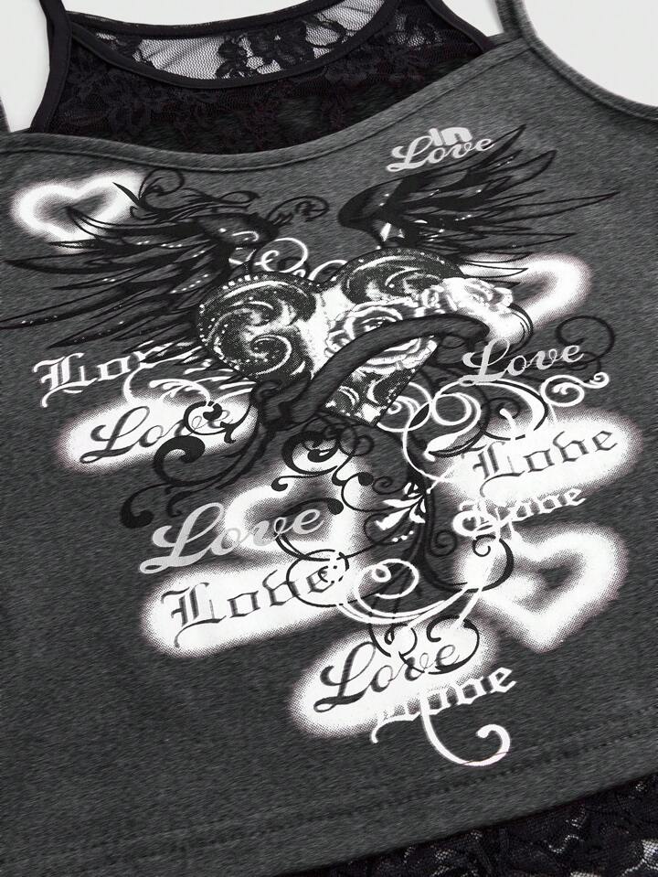 Grunge Punk Top de camiseta de tirantes con estampado de corazones y letras de doble capa para mujer