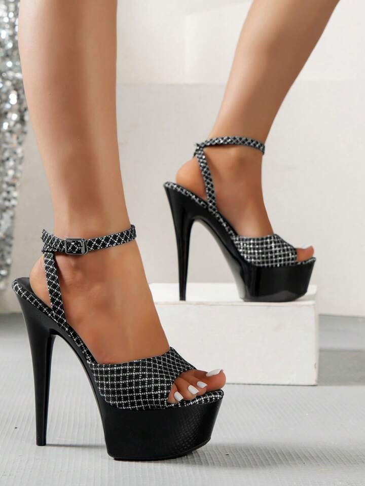 Grunge Punk Mujer Sandalias con patrón de cuadros con tacón delgado de talón abierto moda verano con tacón