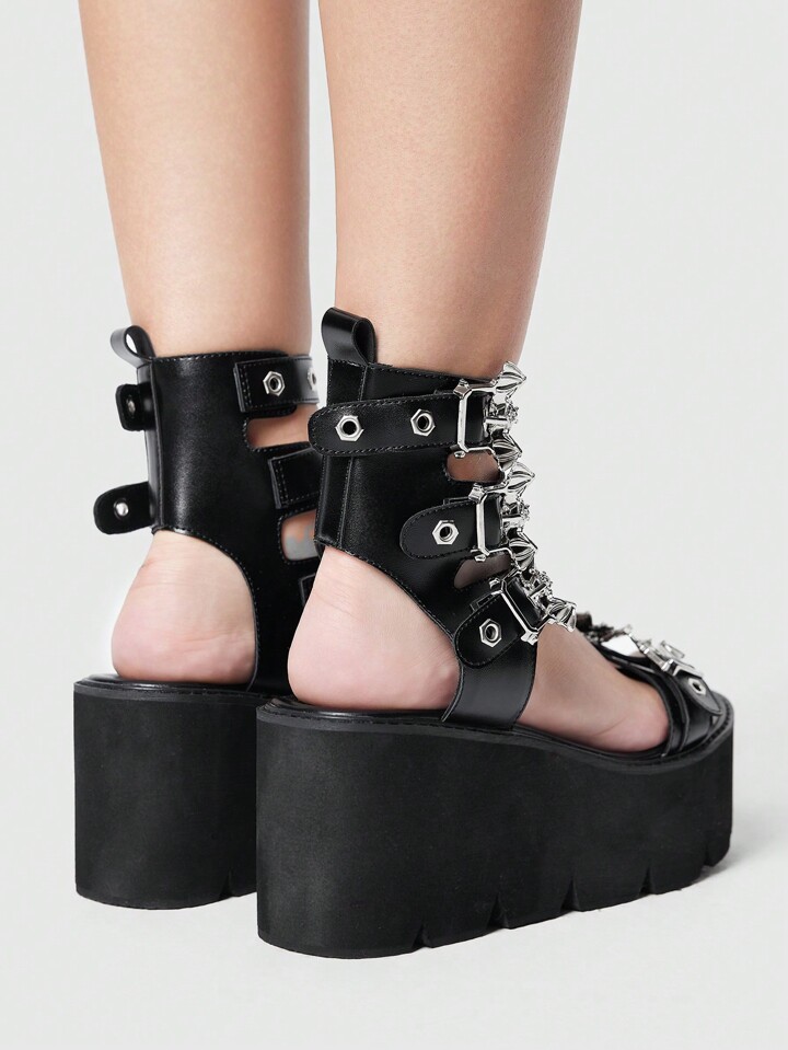 Grunge Punk Sandalias de mujer con suela gruesa y plataforma, estilo punk con puntera redonda, tacón de cuña, remaches y hebilla de correa, zapatos de tacón alto