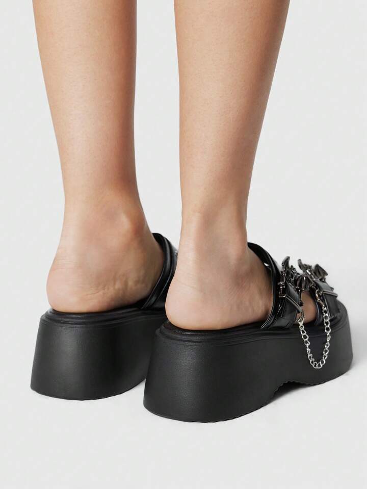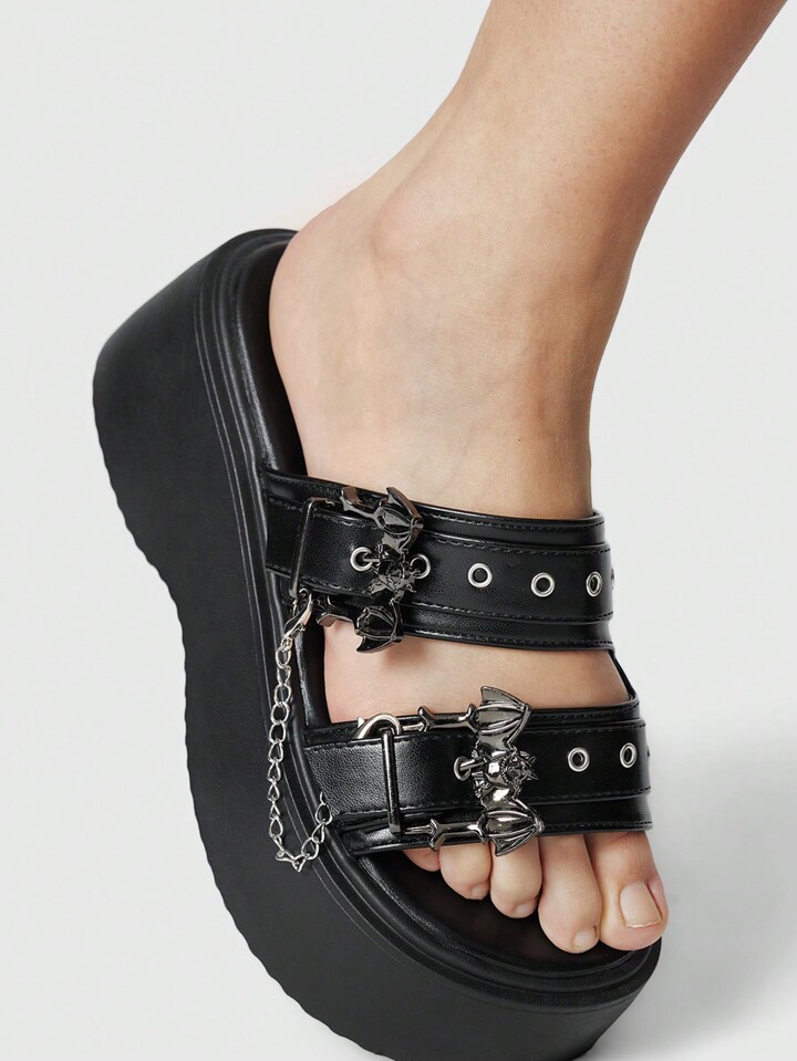 Grunge Punk Sandalias de plataforma negras de PU para mujer, tacón de 6,5 cm, con doble correa con hebilla y decoración de cadena, moda versátil de estilo punk gótico
