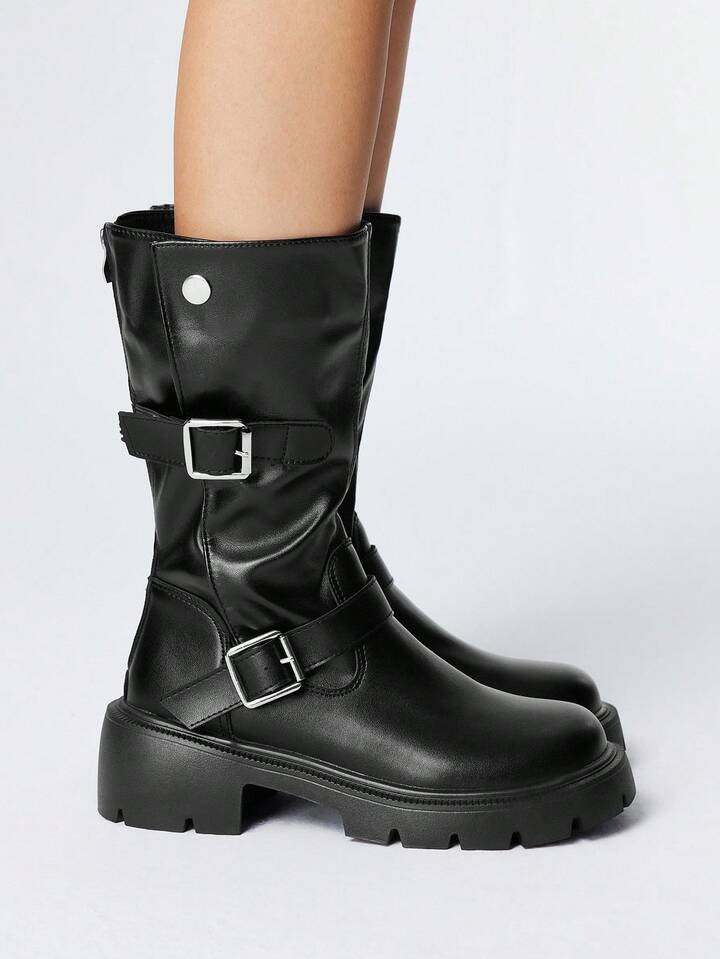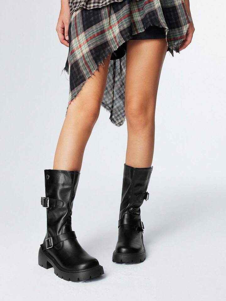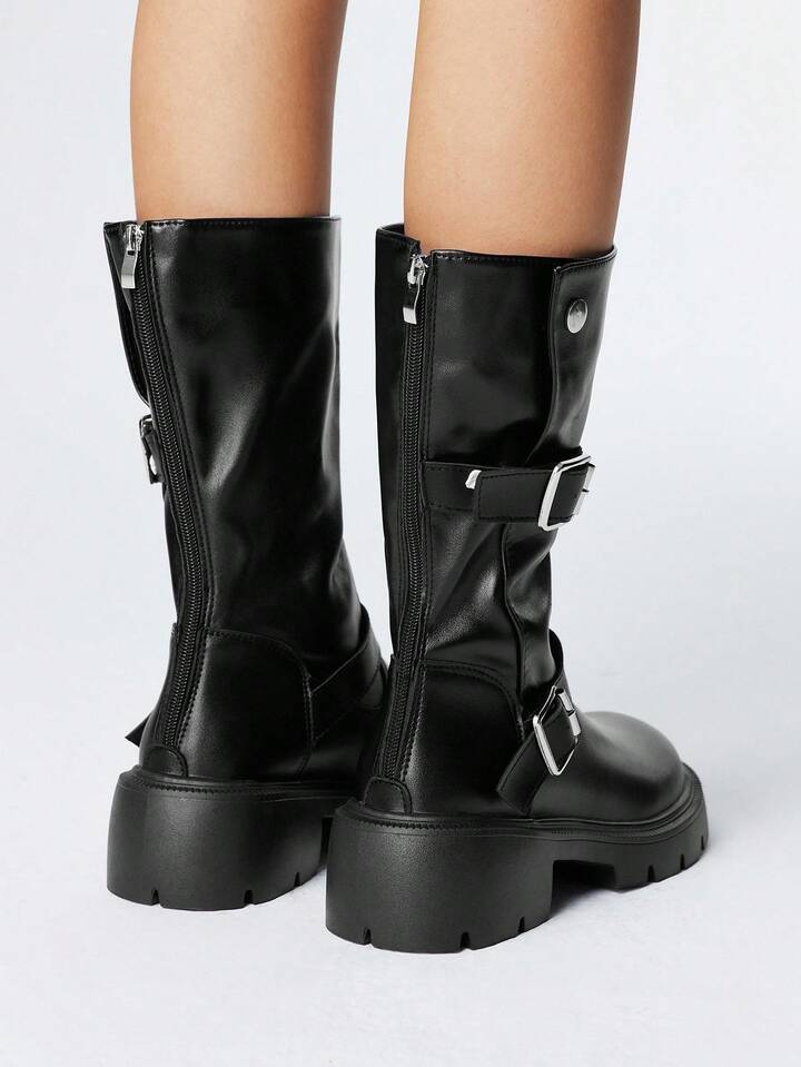 Grunge Punk Botas de montar de tacón grueso con cremallera en la espalda para mujer, botas de motocicleta de tacón bajo con hebilla de cinturón, botas hasta la pantorrilla