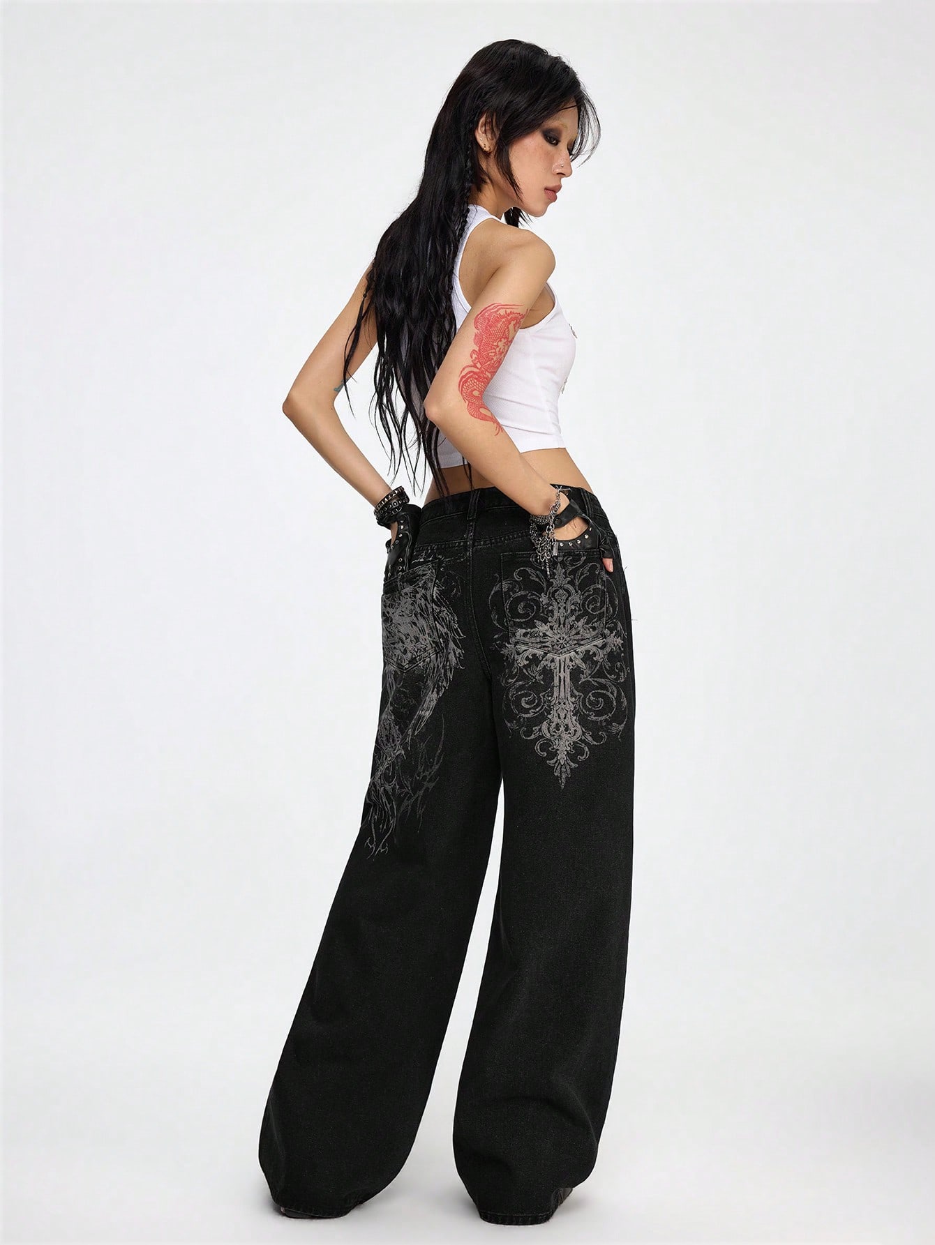 Grunge Punk Jeans de pierna ancha y suelta de talle bajo con estampado de cruz y alas, moda casual de calle para mujer