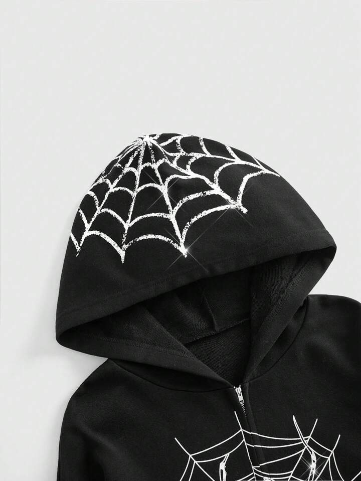 Grunge Punk Sudadera holgada con cremallera, estampado de telaraña con rhinestones, casual para mujer
