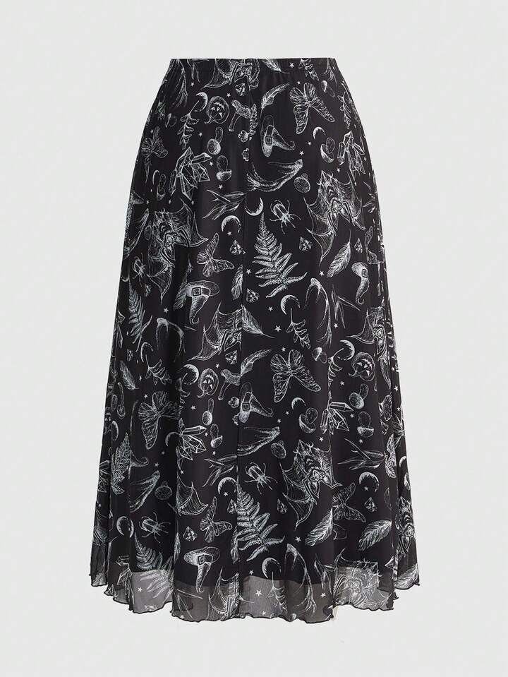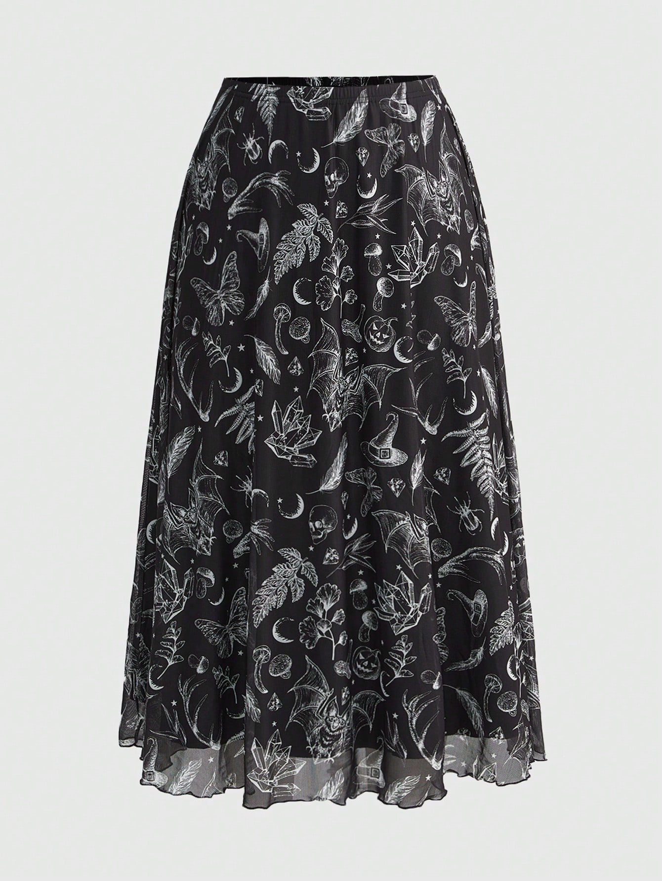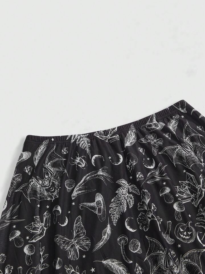 Grunge Punk Minifalda punk de línea A con estampado de murciélago esqueleto, estilo gótico oscuro y misterioso para mujer