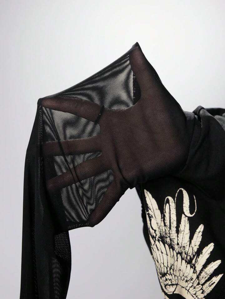 Grunge Punk Top corto con parche de malla, estampado de esqueleto oscuro y punk, y cordones delanteros para mujer