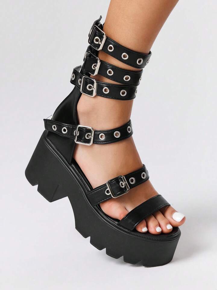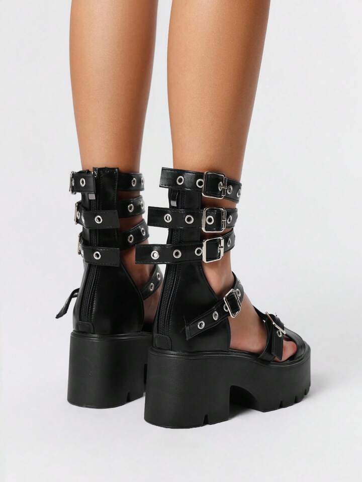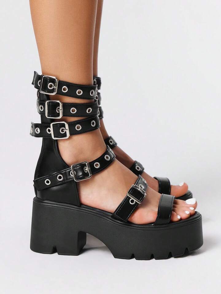 Grunge Punk Sandalias romanas góticas, de rock y punk para mujer, de plataforma con tiras, de tacón alto grueso, para vestidos de verano y playa, Halloween