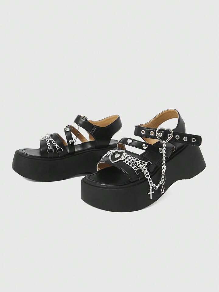 Grunge Punk Sandalias romanas huecas de mujer con decoración de cadena con hebilla con forma de corazón, diseño de plataforma de 6.5 cm, PU negro, de moda para fiesta, citas y uso diario