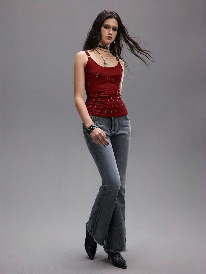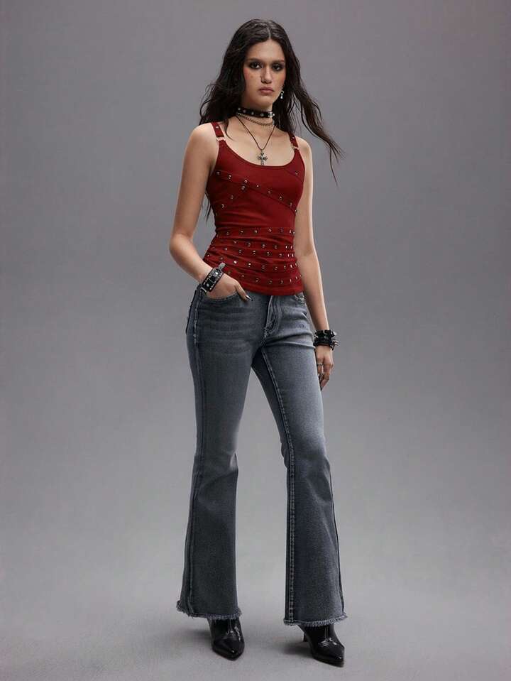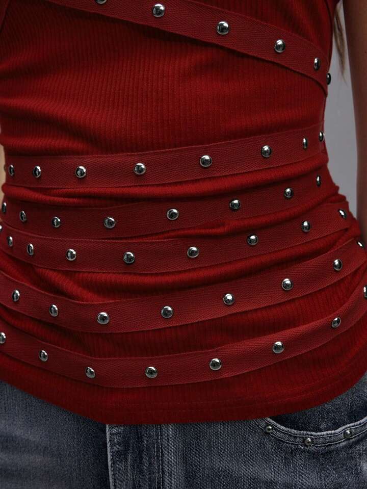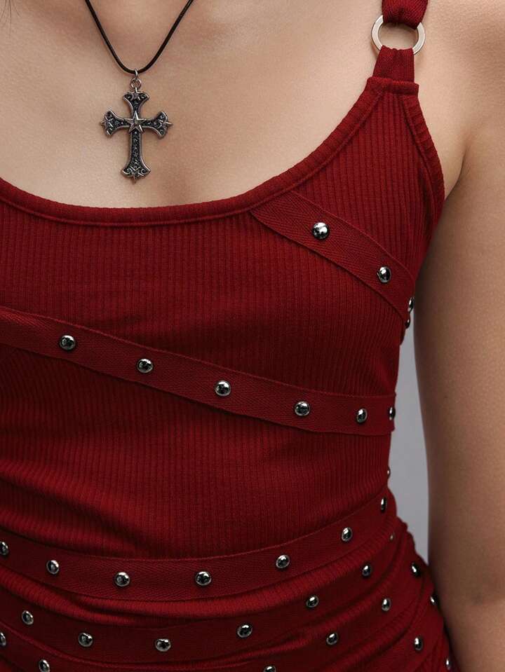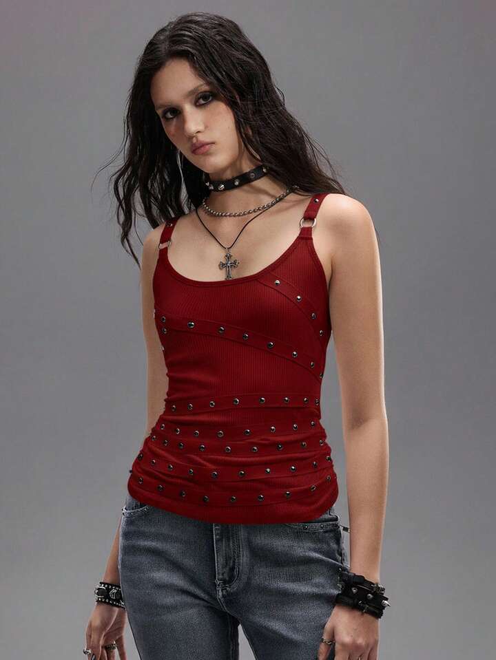 Grunge Punk Chaleco sin mangas sexy de mujer con tirantes finos, escote bajo, negro, con tachuelas, rhinestones y cintas, adecuado para verano, playa, graduación, Pascua, conciertos, vacaciones en Nashville, festivales de música, rock
