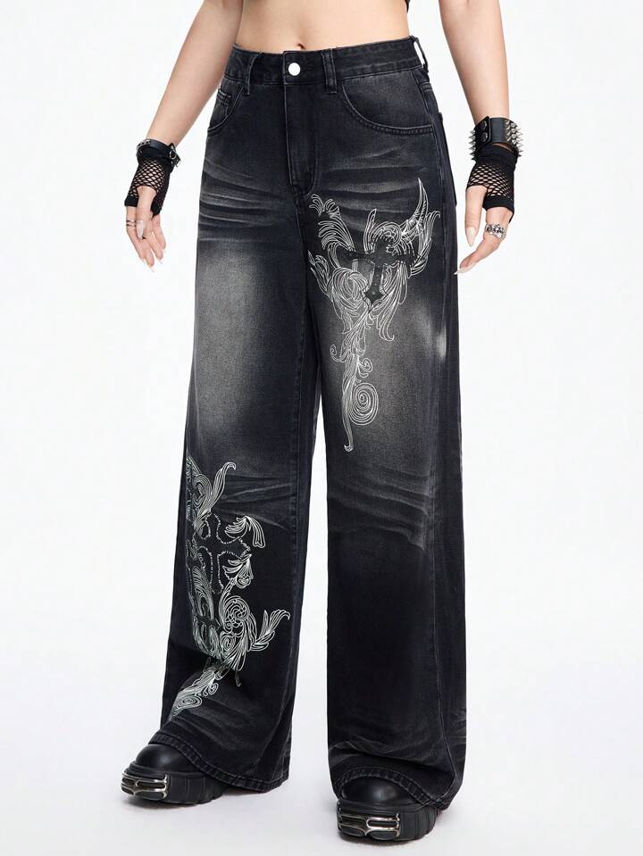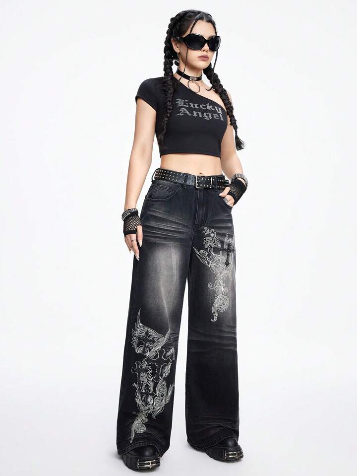 Grunge Punk Jeans casuales de tiro alto holgados con diseño cruzado y bolsillos para mujer