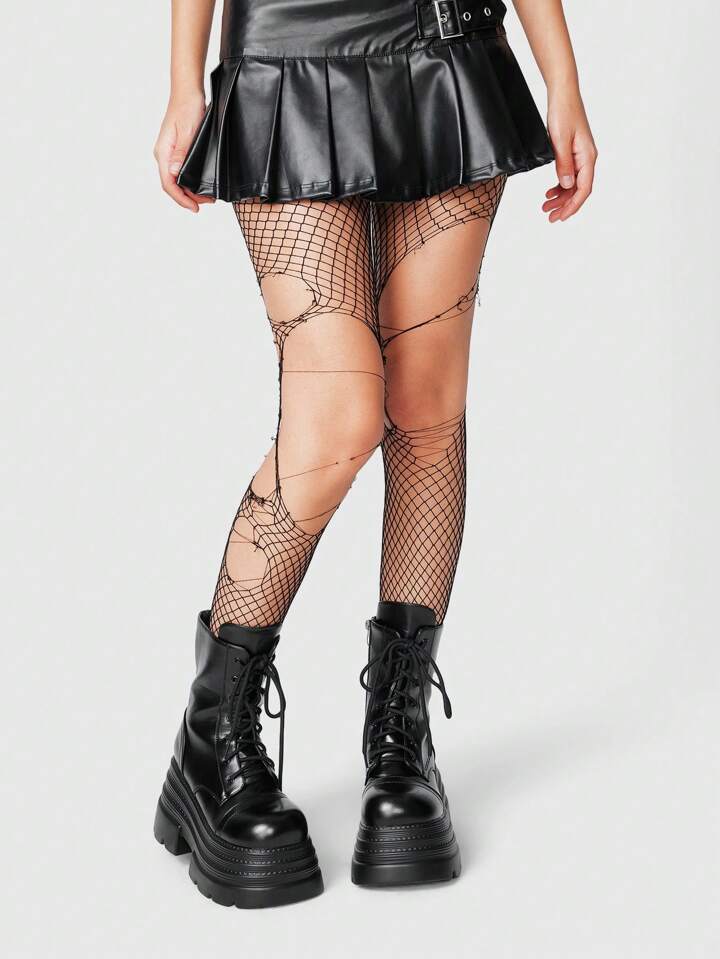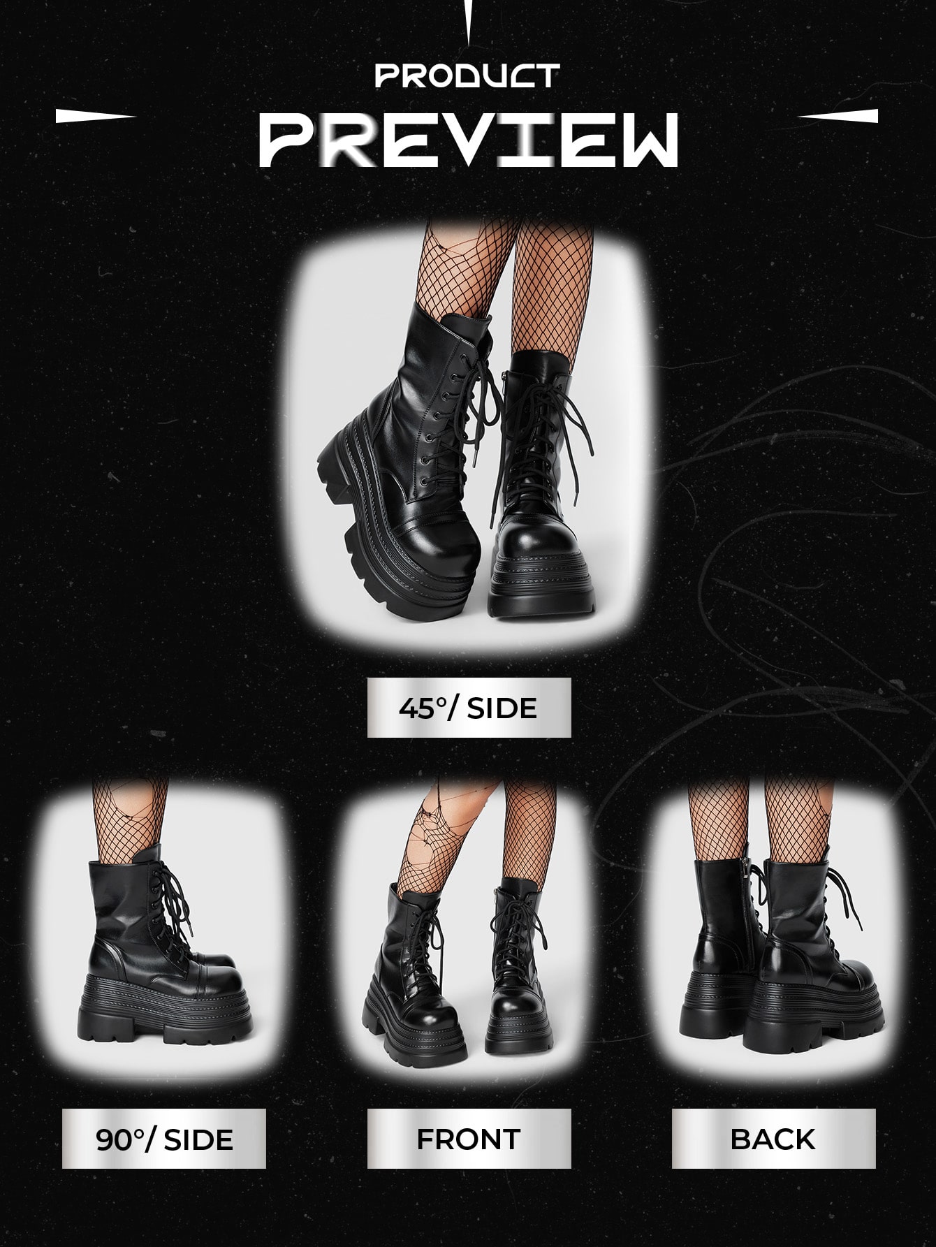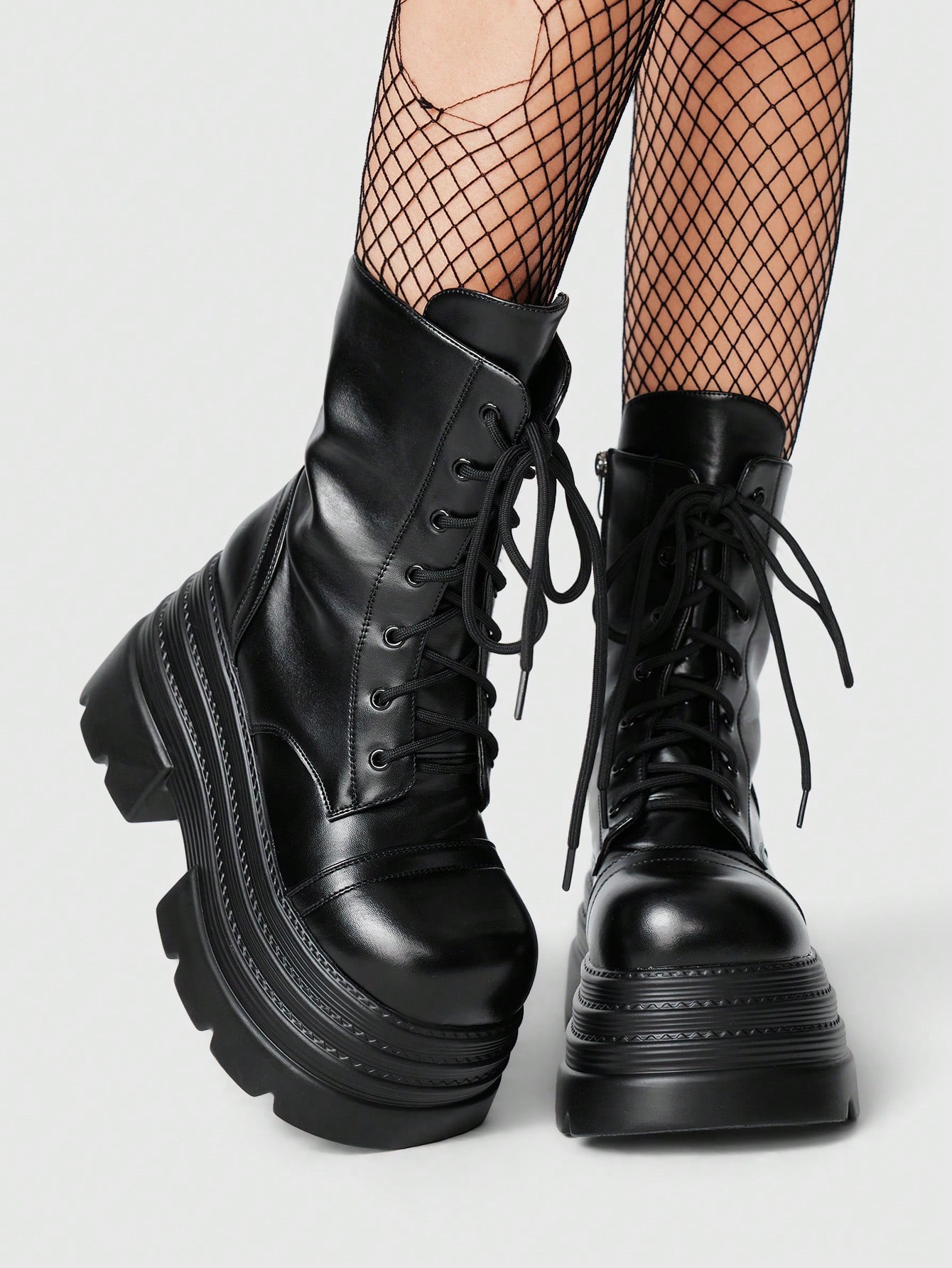 Grunge Punk Botas de media caña con plataforma redonda multicapa, estilo punk oscuro de PU negro, estilo casual de campus punk de calle para mujer