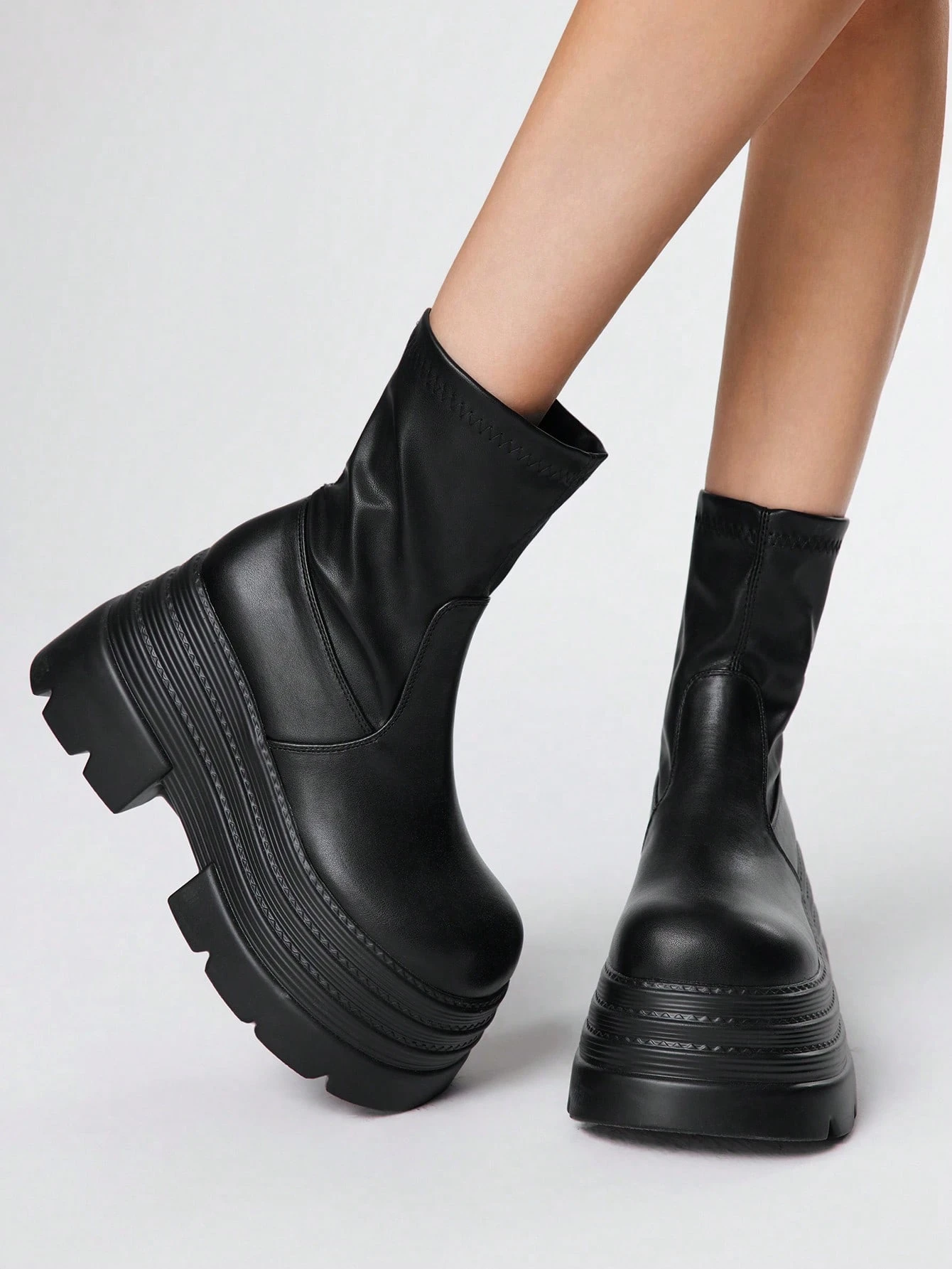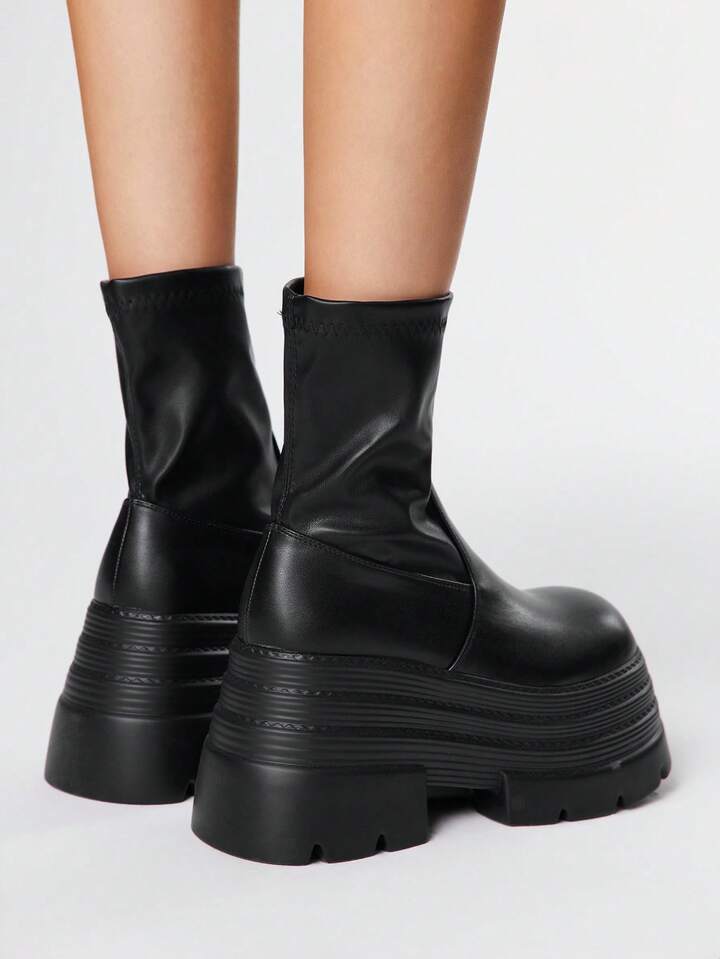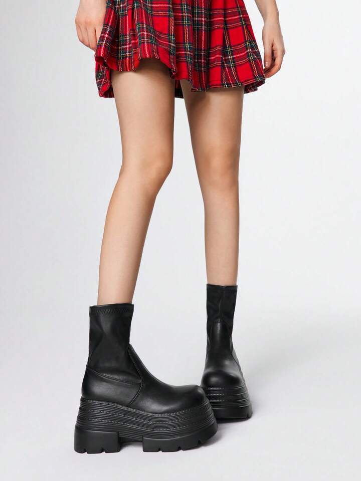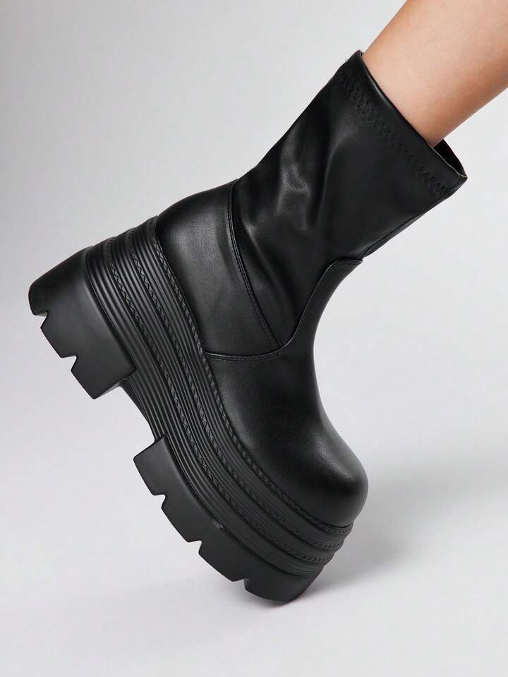 Grunge Punk Botas de plataforma de múltiples capas con puntera redonda, estilo punk oscuro, cuña elástica, parte superior de cuero, nuevas botas de media pantorrilla para el otoño/invierno, uso diario, estilo punk callejero, campus, caballero