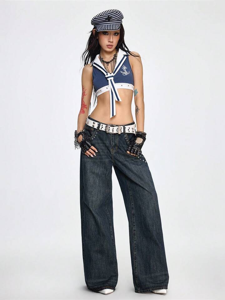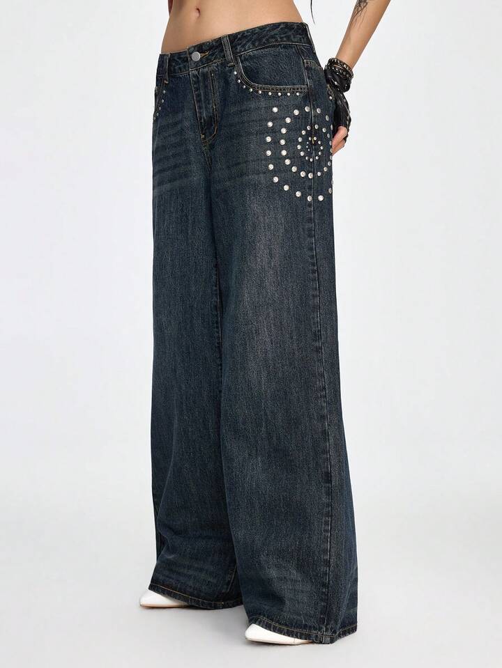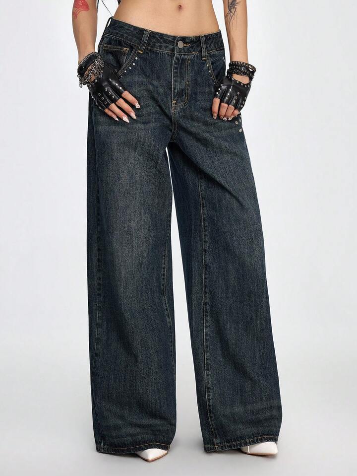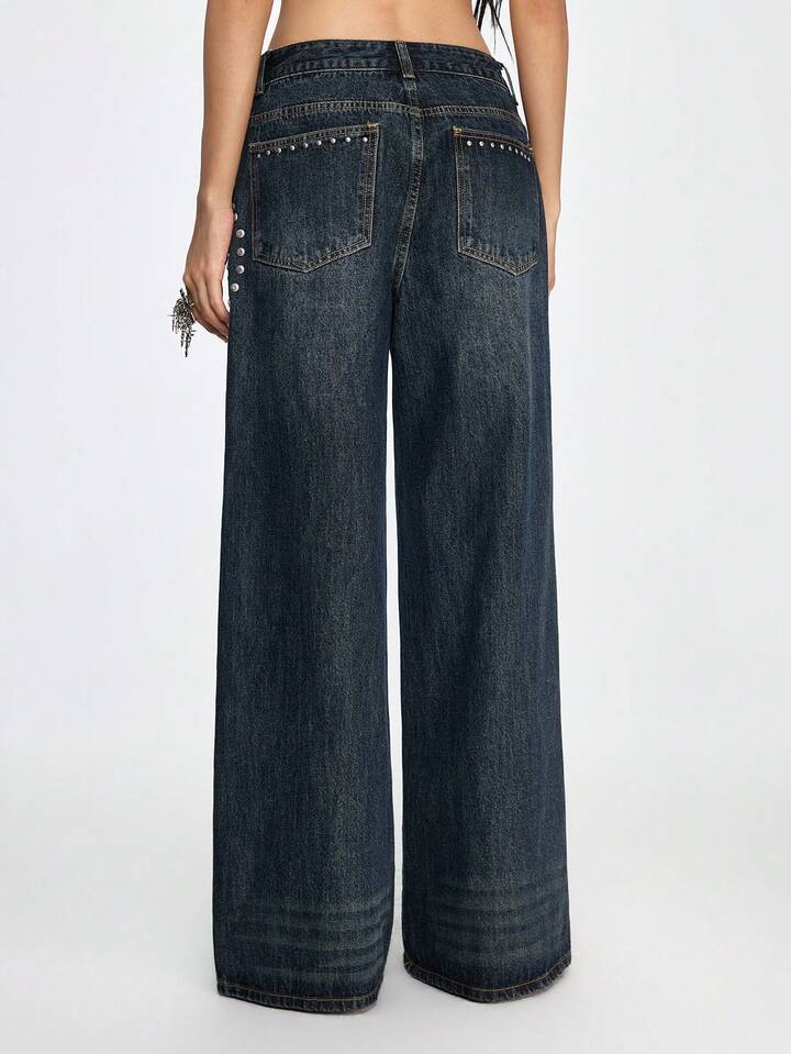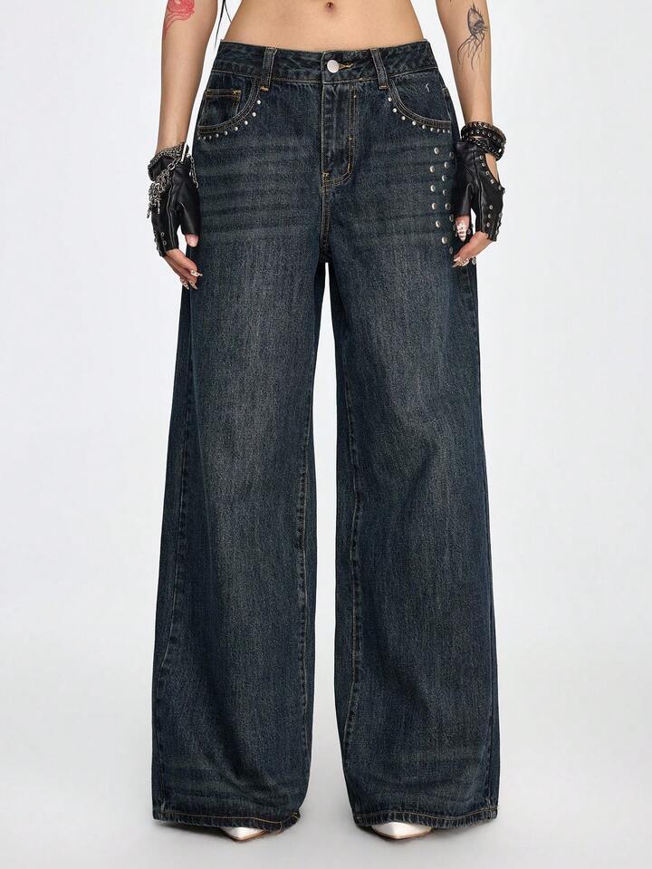 Grunge Punk Jeans de pierna ancha con lavado vintage, botones, remaches y bolsillos para mujer