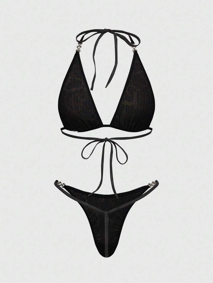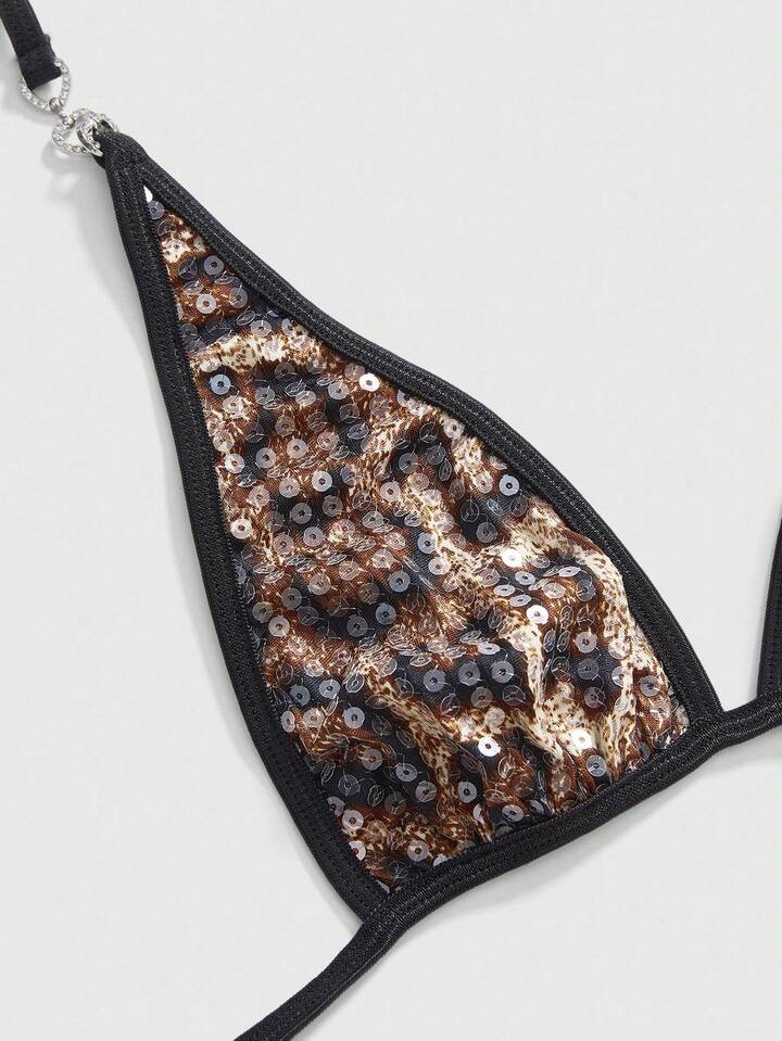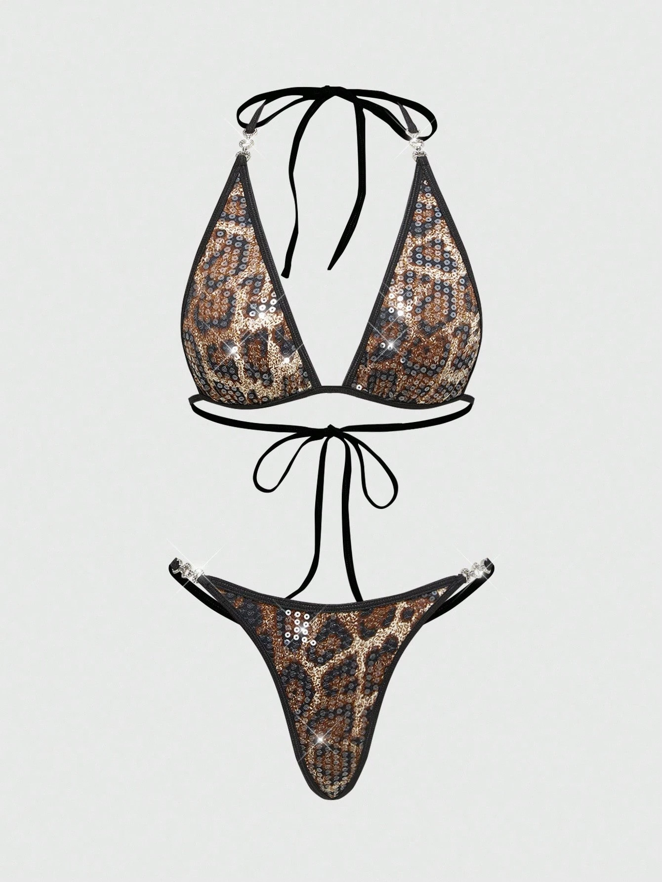 Grunge Punk Conjunto de lencería con estampado de leopardo con lentejuelas, estilo sexy y halter, para fiesta en la playa, estilo callejero de festival, Y2K Millennium