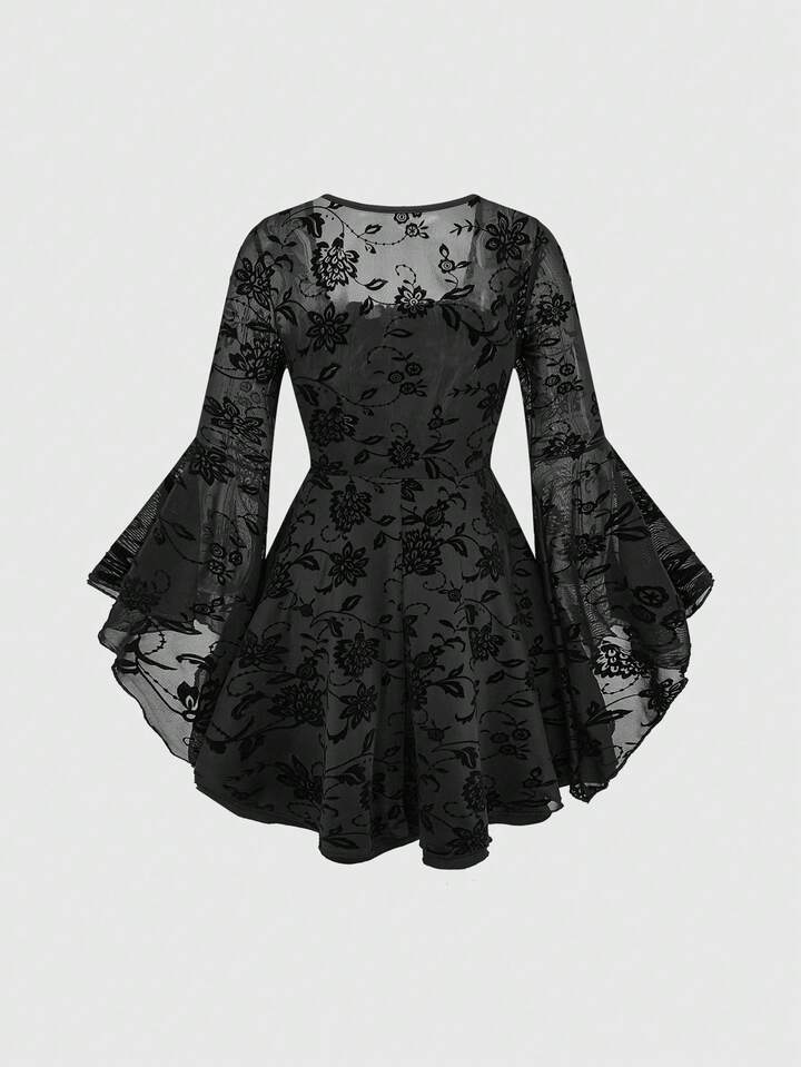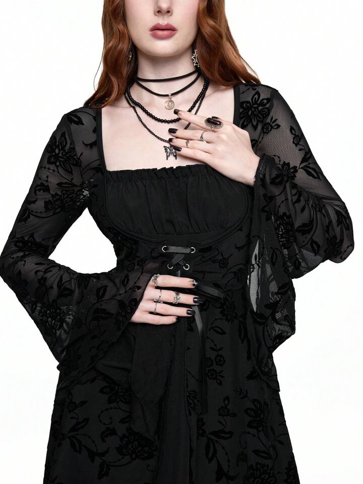 Grunge Punk Vestido con mangas acampanadas, cintura anudada, parches y estilo gótico retro oscuro de bruja para mujer