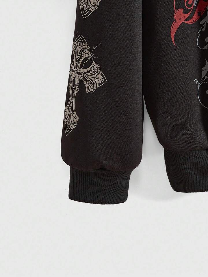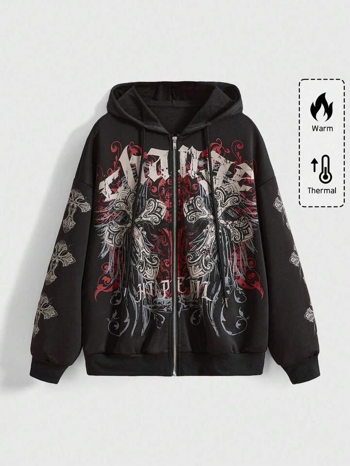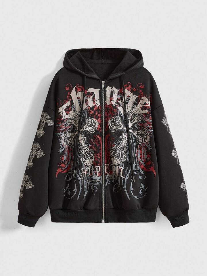 Grunge Punk Sudadera holgada con abertura frontal, estilo retro Y2K, con diseño de vid y cruz, estilo punk para mujer