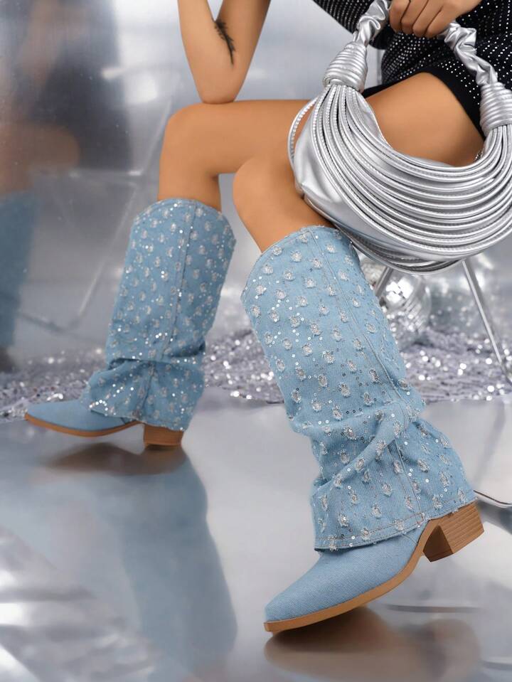 Grunge Punk Botas de caña media con puntera puntiaguda y tacón bajo, con rasgados y lentejuelas, de color azul cielo, estilo punk, para uso casual diario y urbano, ideales para la Navidad, Año Nuevo y el otoño-invierno