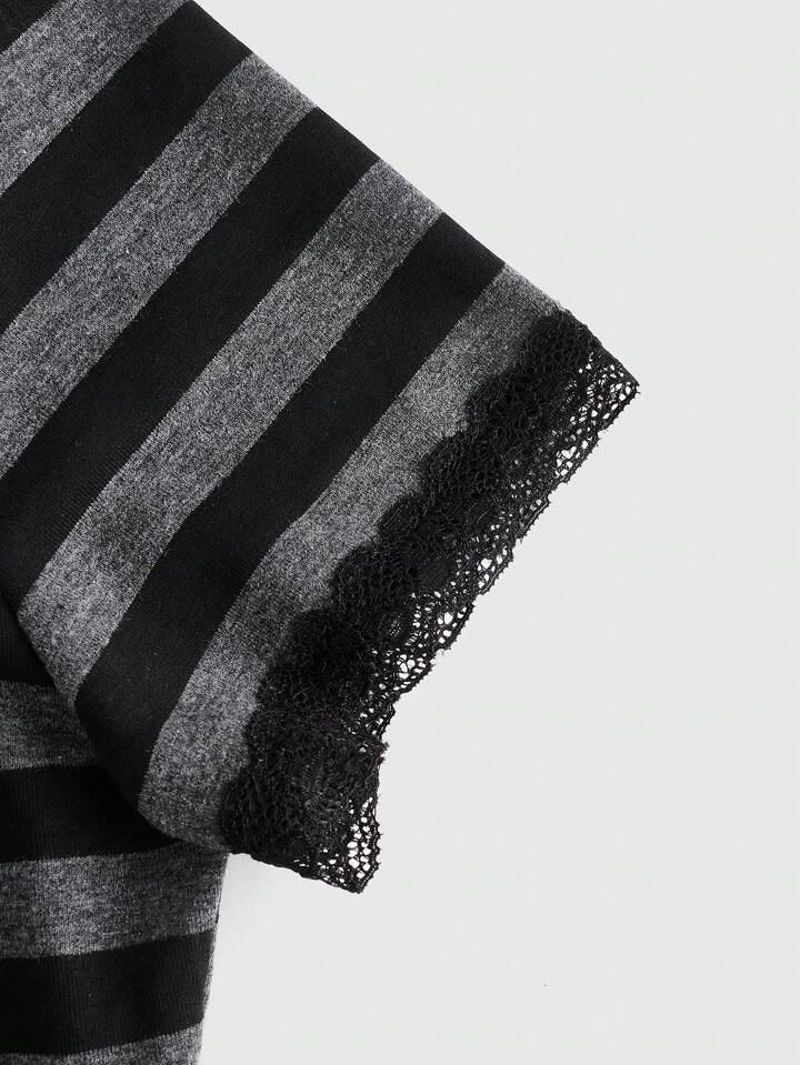 Grunge Punk Camiseta de rayas de ajuste entallado para mujer con detalles fruncidos y ribete de encaje, escuela