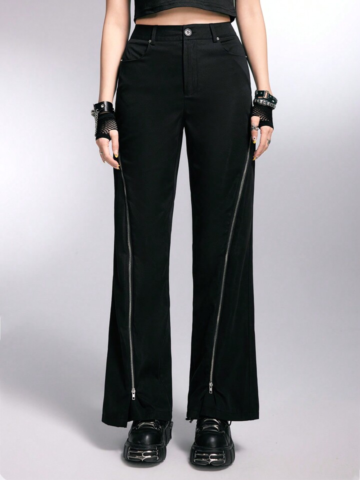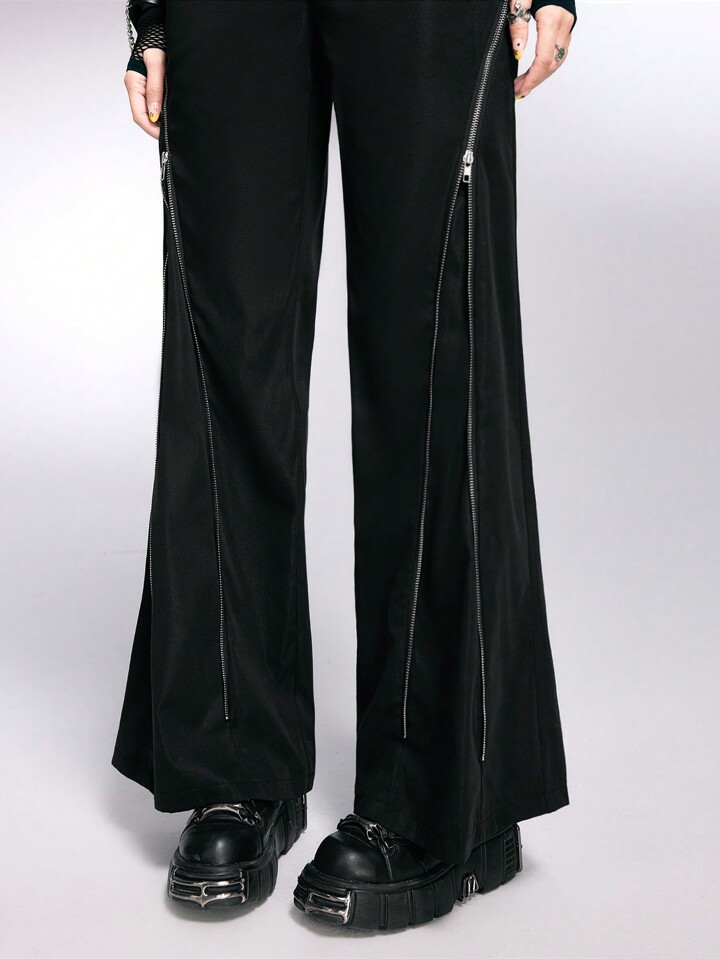 Grunge Punk Pantalones De Pierna Ancha Sueltos De Color Sólido Con Cintura De Botón Y Cierre De Cremallera De Metal Para Mujer