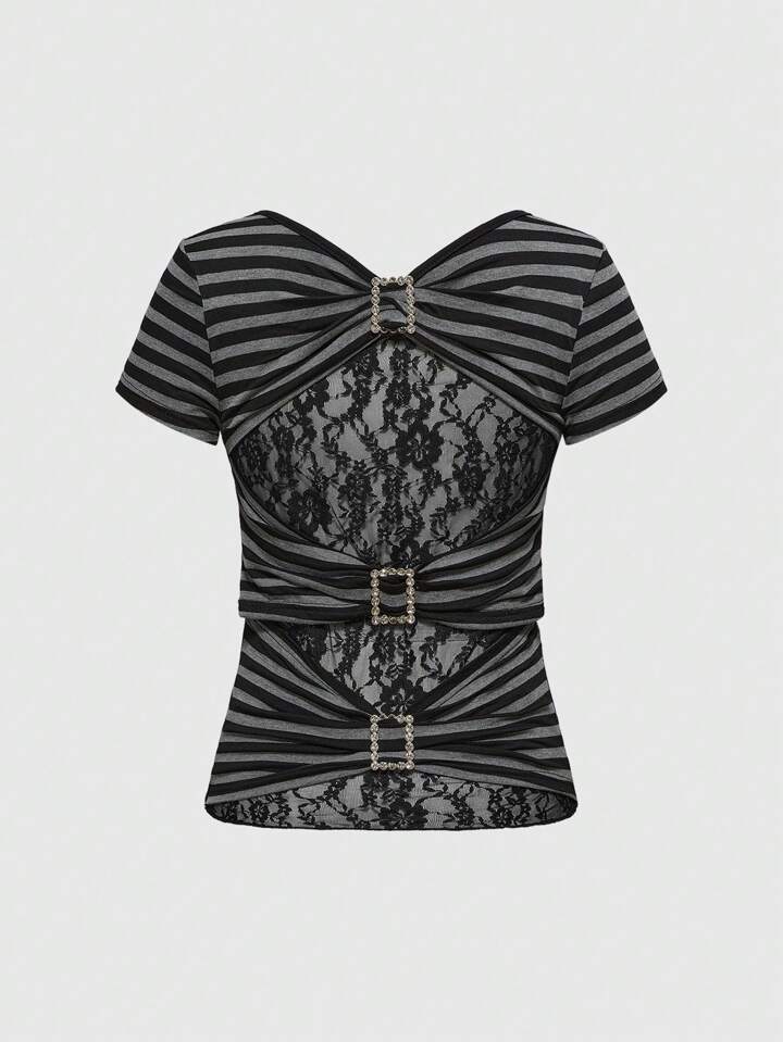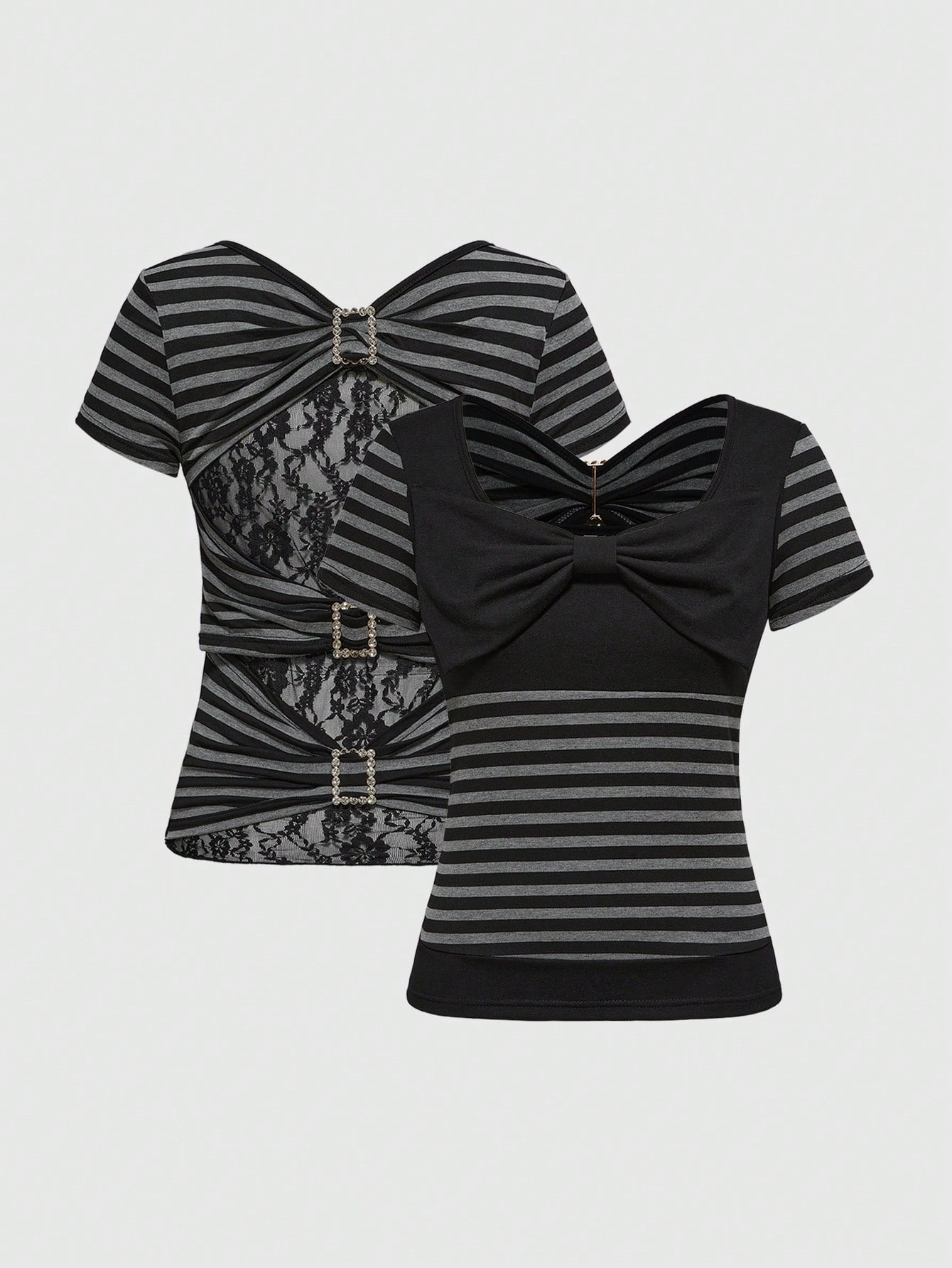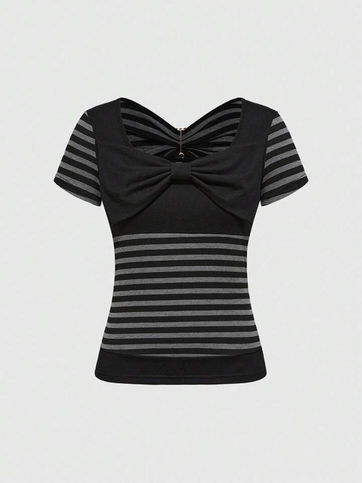 Grunge Punk Blusa de manga corta con rayas y lazo en la espalda, estilo Y2K, para verano