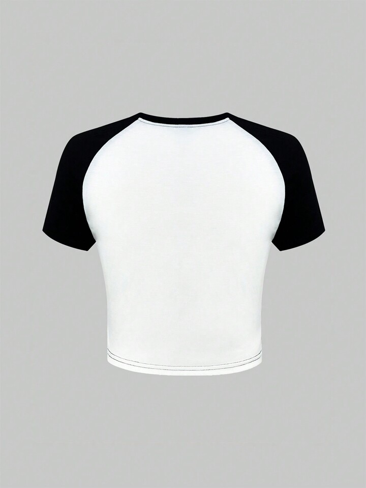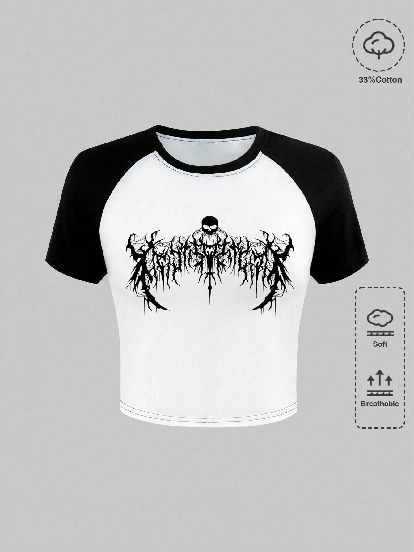 Grunge Punk Camiseta de ajuste ceñido con estampado de eslogan de calavera gótica vintage oscura, cuello redondo y mangas raglán con contraste, estilo Y2K