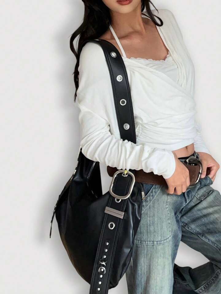 Grunge Punk Bolso de hombro inclinado con estilo punk de metal grunge Y2K, correa ancha ajustable, bolso casual para damas, adecuado para ir al trabajo, compras, viajes y otras ocasiones