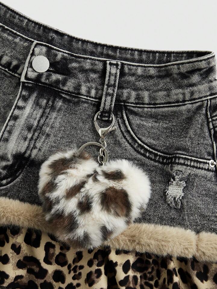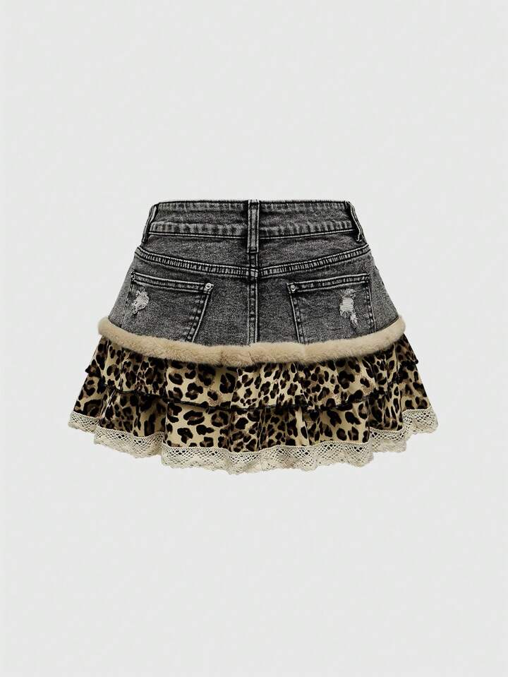 Grunge Punk Minifalda vaquera con dobladillo de volantes y estampado de leopardo patchwork en estilo Gyaru Y2K