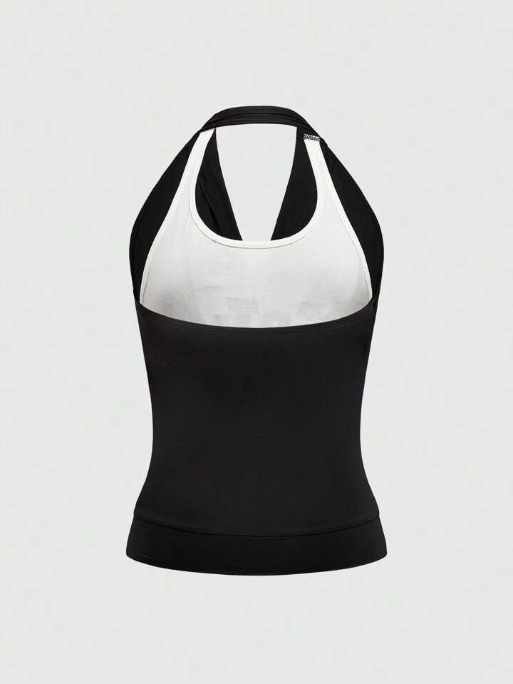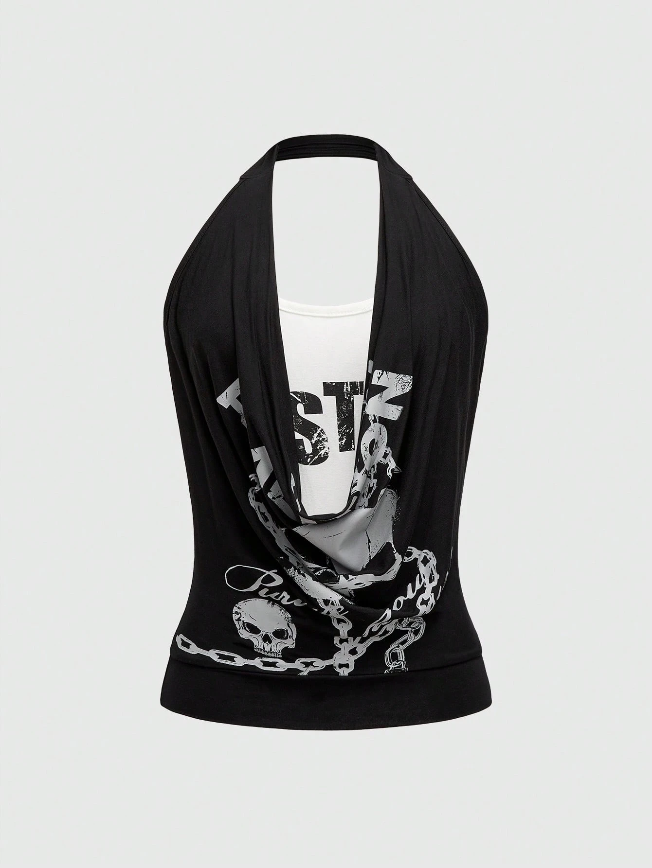 Grunge Punk Camiseta de tirantes con cuello de capas y gráfico de calavera, estilo Harajuku Punk Edgy para mujeres
