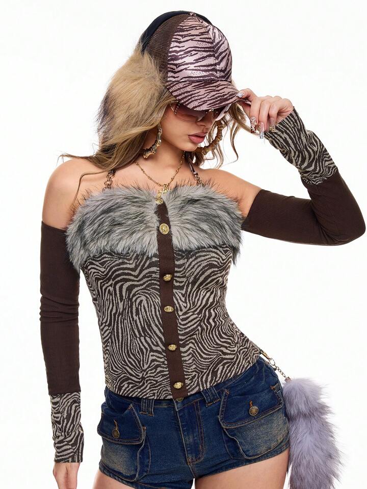 Grunge Punk Set de top corto y mangas con estampado de cebra velloso patchwork en estilo Harajuku Y2K