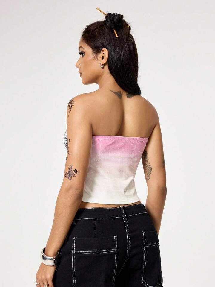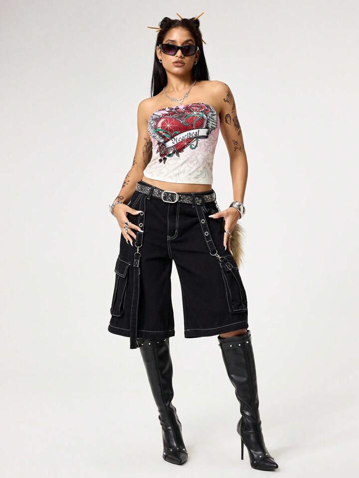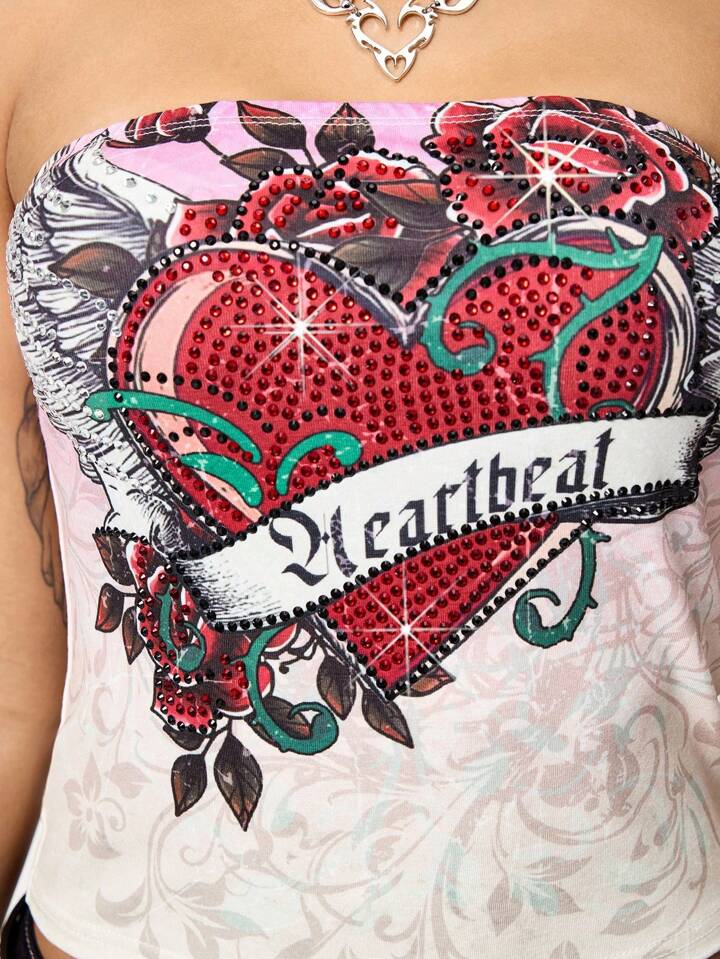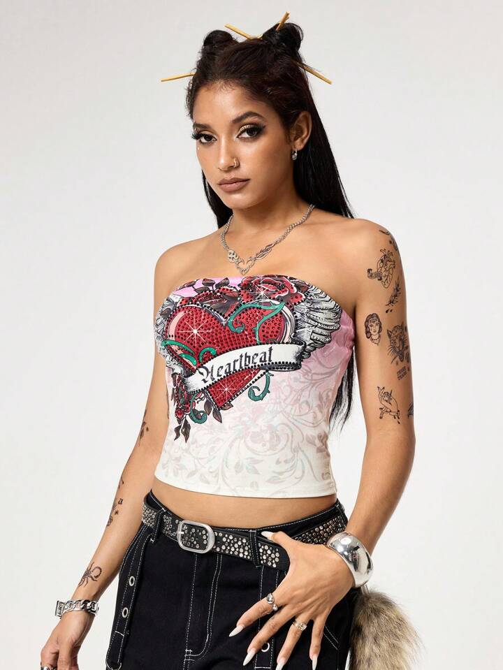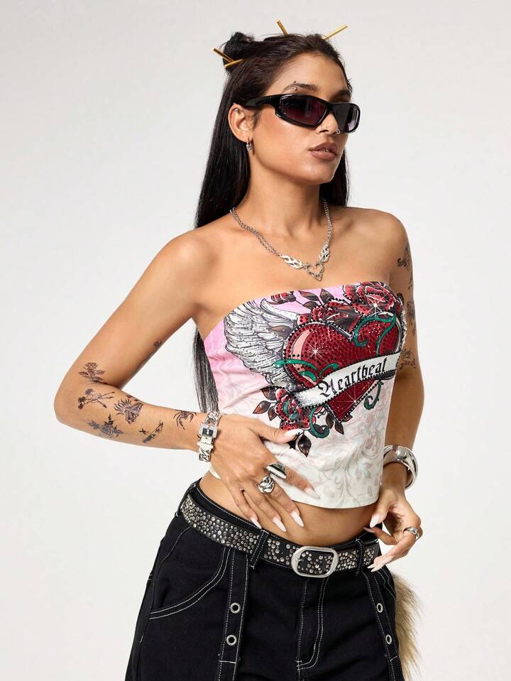 Grunge Punk Top camisola ajustado y corto con estampado de corazones, alas y enredaderas, decorado con rhinestones, con estilo sexy y punk de los años 2000