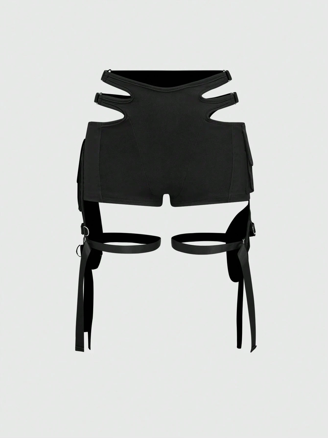 Grunge Punk Pantalones cortos con bolsillos de carga 3D funcionales y diseño estructural con correa de pierna en estilo Y2K para mujeres