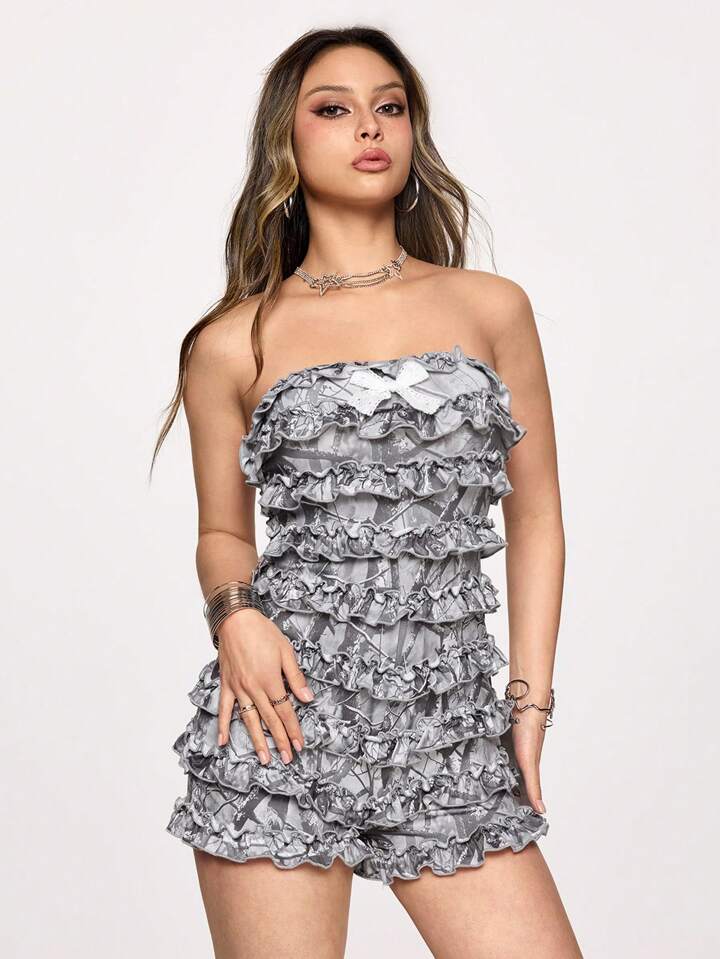 Grunge Punk Conjunto de verano estilo Y2K para mujeres, mono con volantes en capas de estilo Harajuku con estampado de leopardo