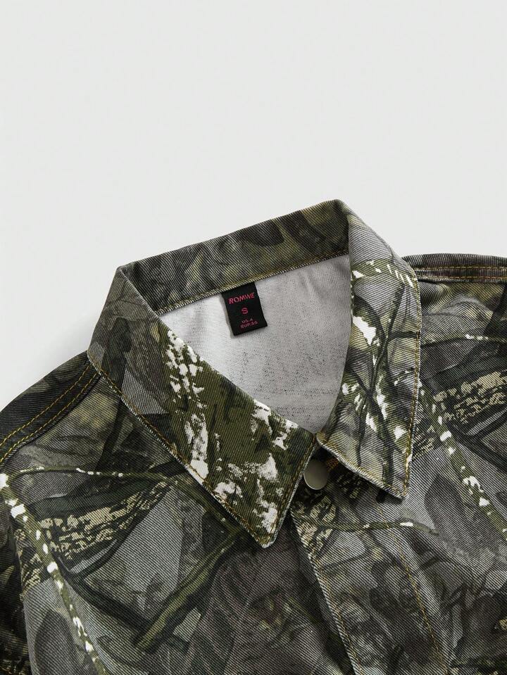 Grunge Punk Chaqueta vaquera con estampado vintage de camuflaje y árboles desnudos, lazo rosa y cordones para mujer, Y2K