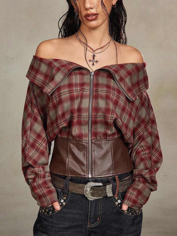 Grunge Punk Camisa de manga larga con hombros descubiertos, cintura ceñida y parches de cuadros en estilo vintage Y2K