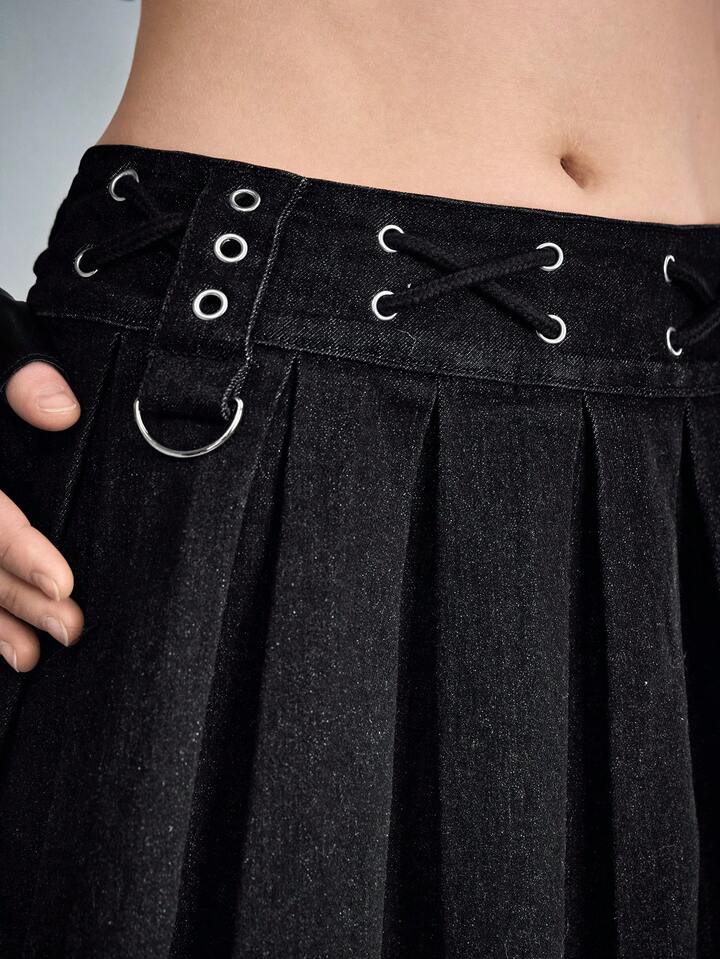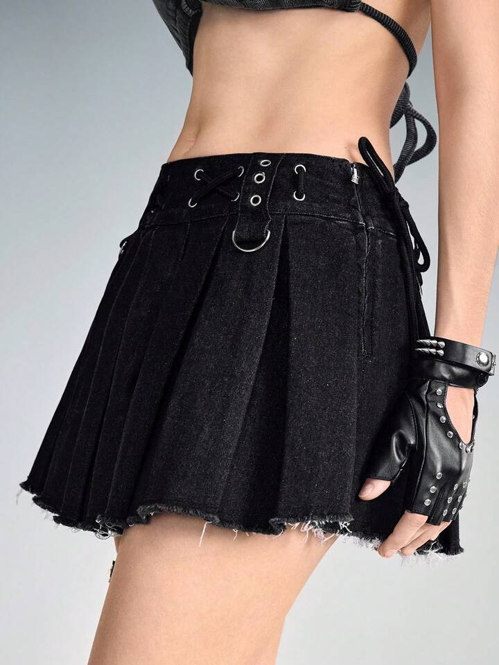 Grunge Punk Minifalda de mezclilla con pliegues, cordones y encaje vintage desgastado estilo Y2K para mujeres