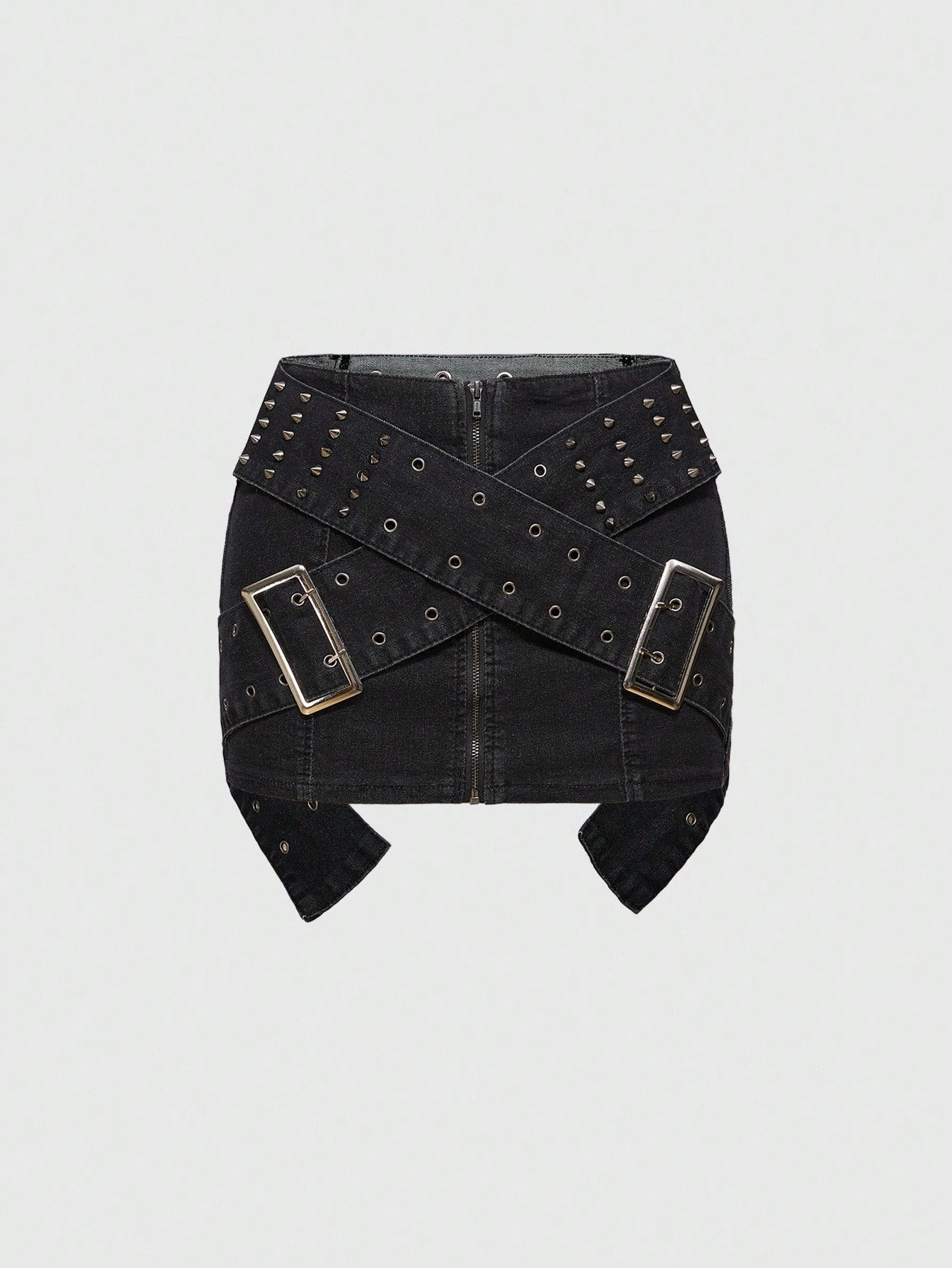 Grunge Punk Minifalda de mezclilla para mujer decorada con remaches y ojetes metálicos de estilo vintage punk Y2K