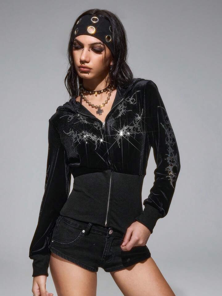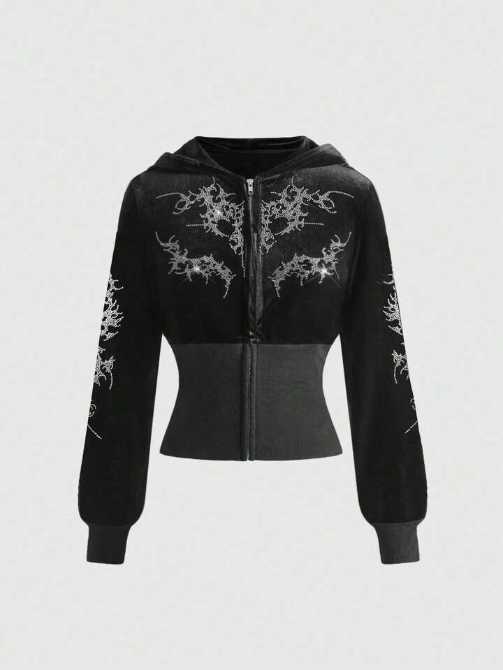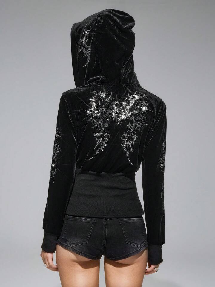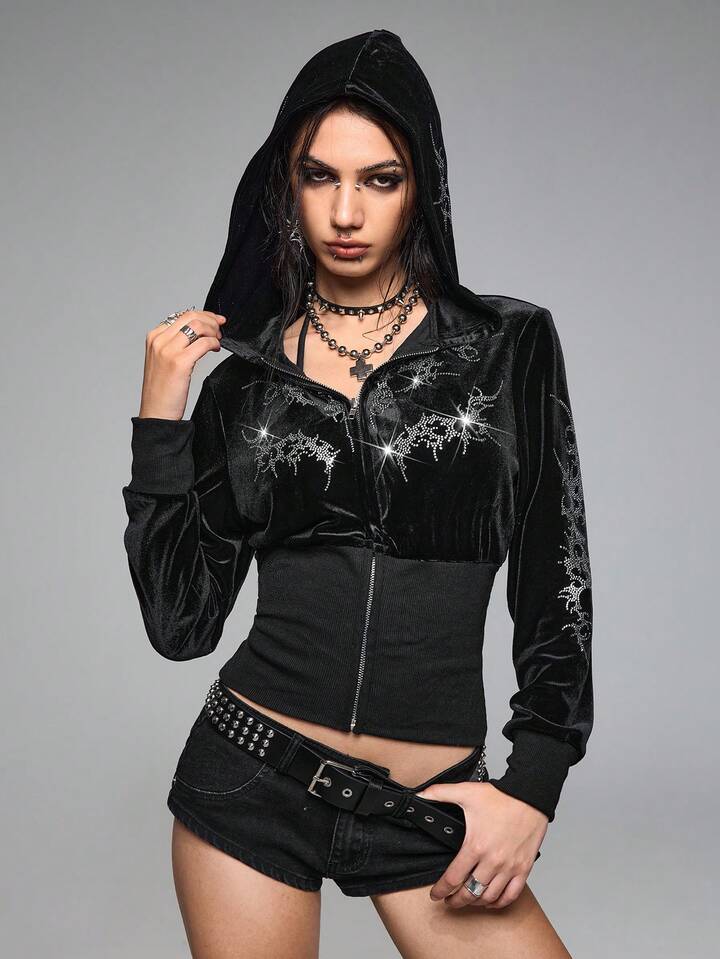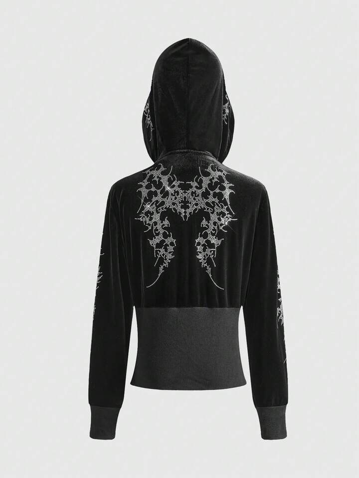 Grunge Punk Sudadera con capucha con gráfico de espinas y alas, ajustada y con tachuelas, estilo vintage Y2K para mujeres