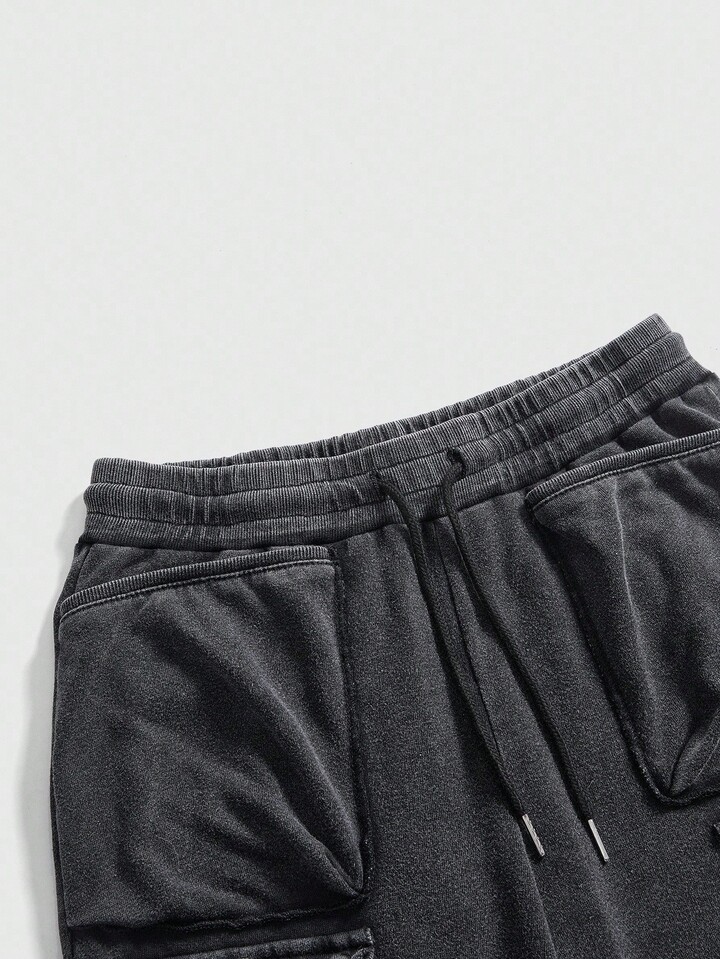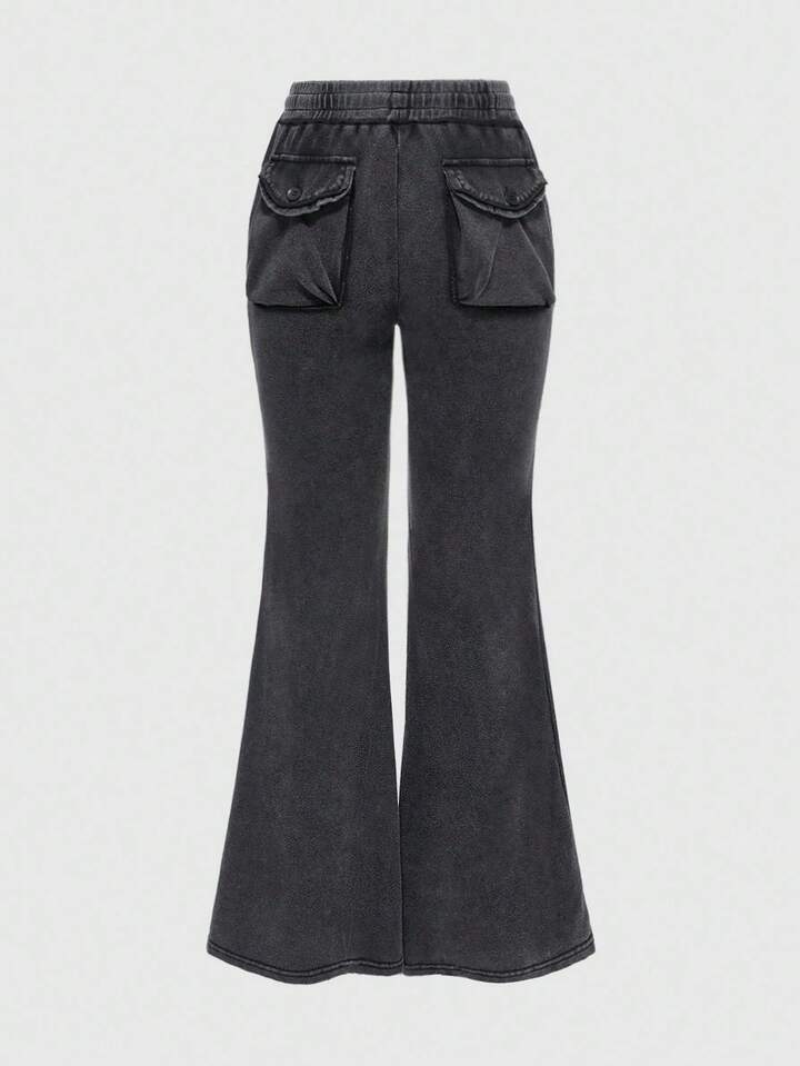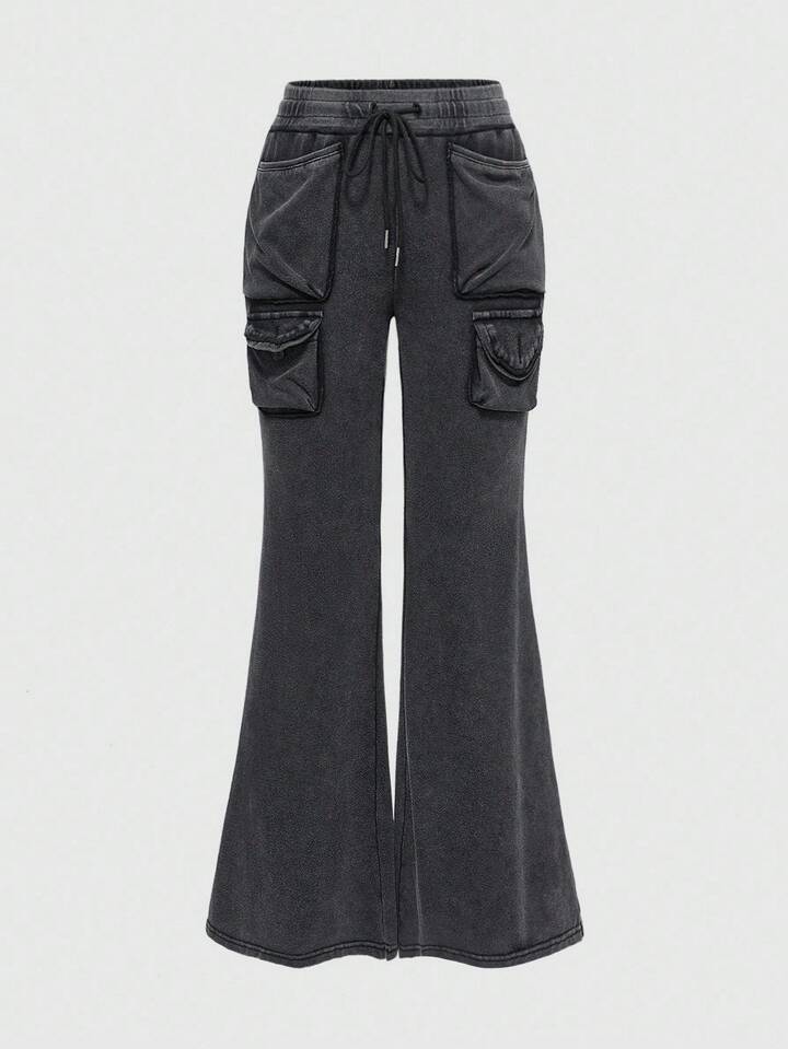 Grunge Punk Pantalón de chándal de talle súper bajo, lavado vintage, con decoración de bolsillo 3D y efecto esponjoso oversize, estilo Y2K