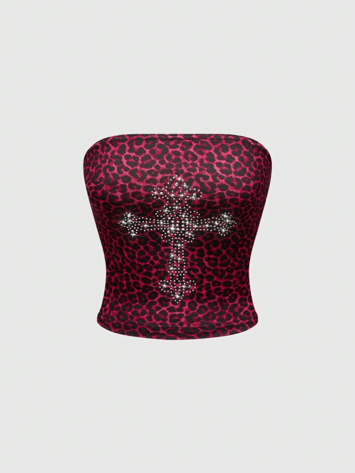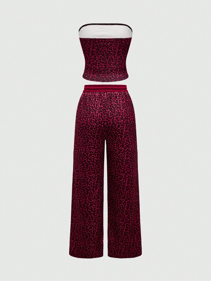 Grunge Punk Conjunto de 2 piezas Y2K sexy compuesto por top corto de estampado de leopardo y pantalón de pierna ancha con lazo para mujer