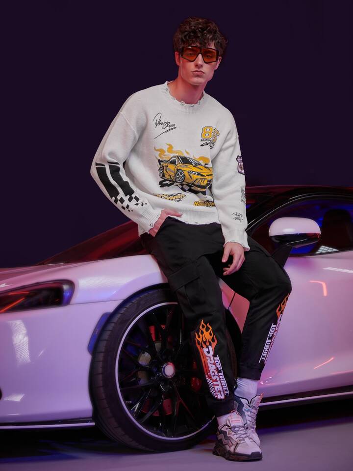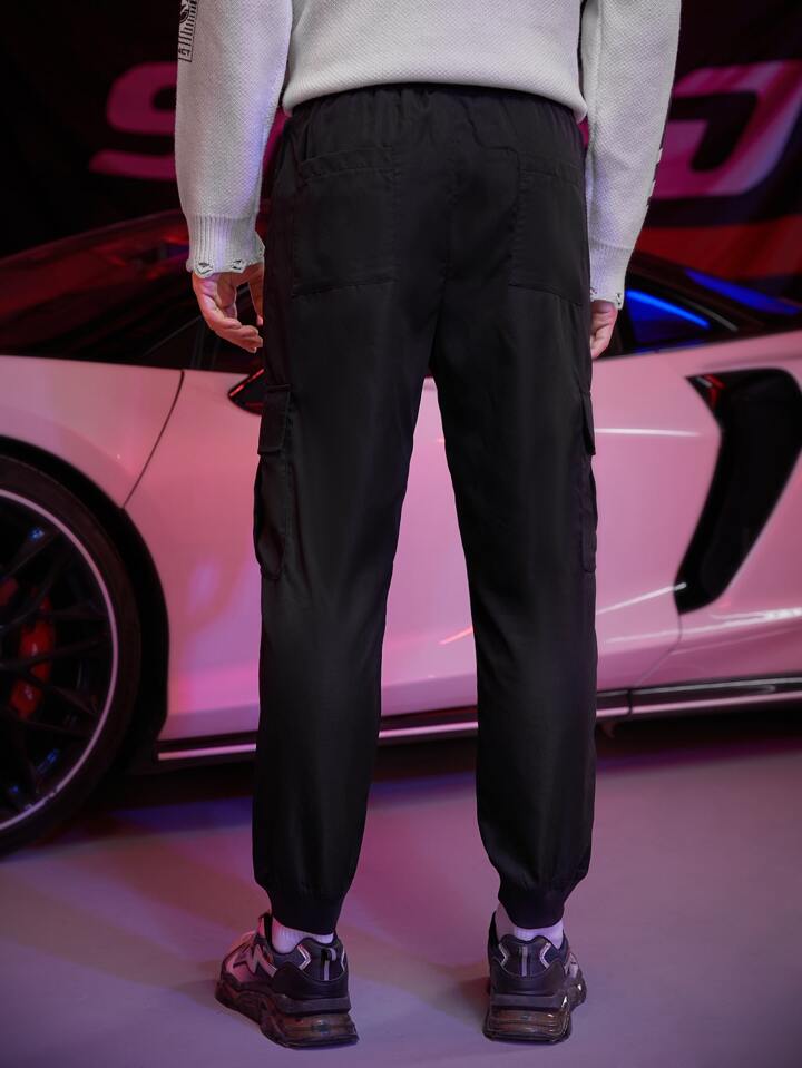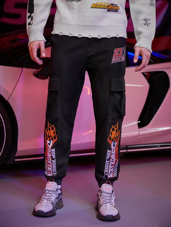 Hombres Pantalones cargo de cintura con cordón con estampado de letra y fuego