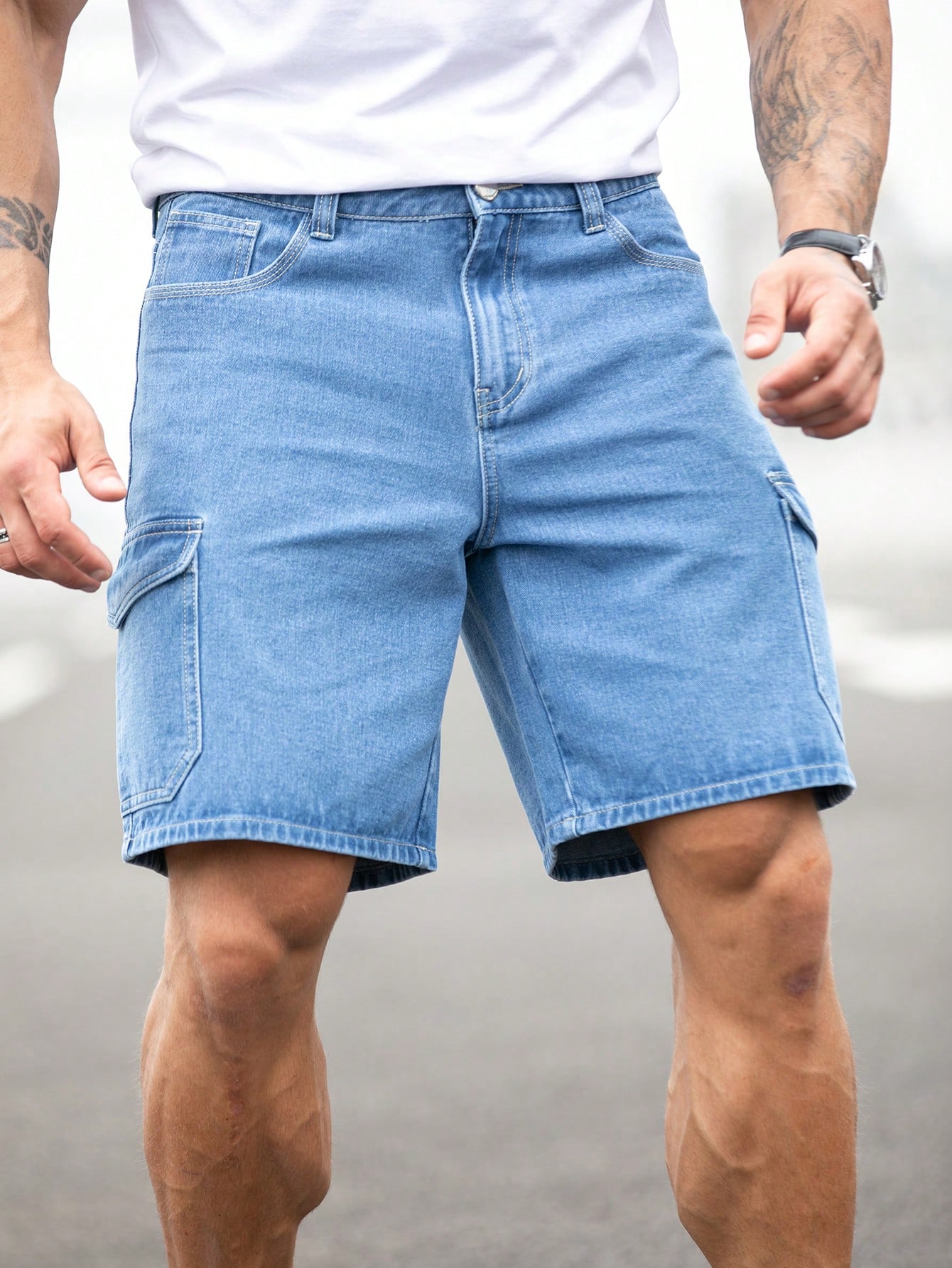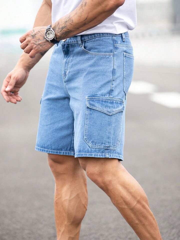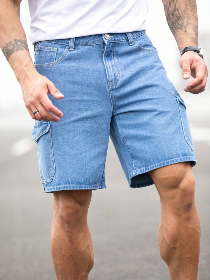 Bermudas De Mezclilla Para Hombres Con Bolsillo De Solapa En El Lateral