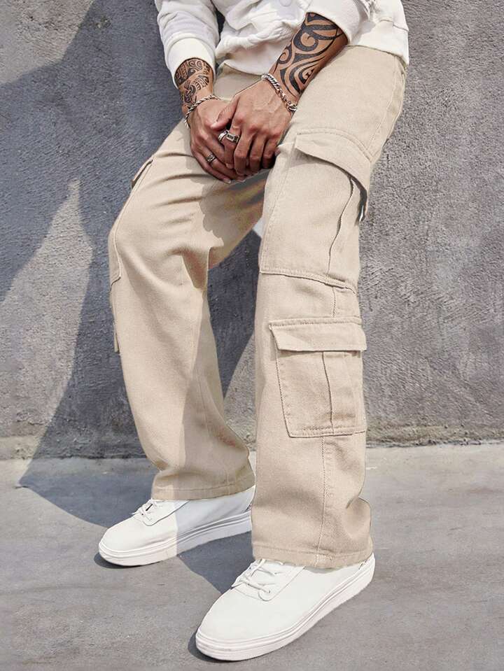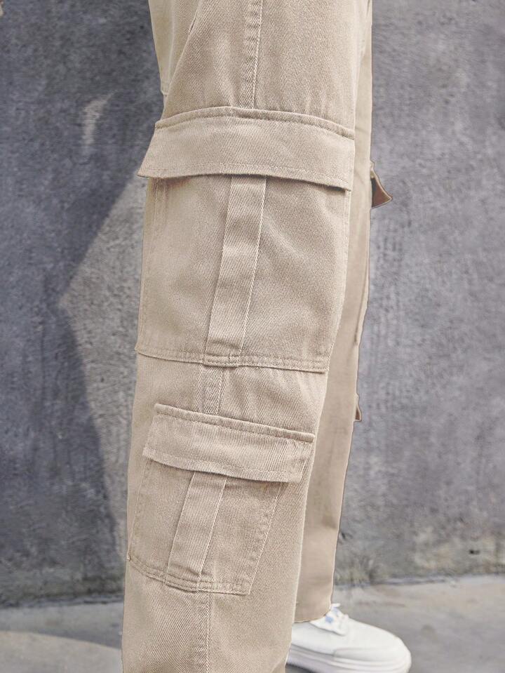 Pantalones vaqueros con bolsillo con solapa lateral para hombres, Pantalones cargo para hombres Manfinity, Pantalones cargo color caqui, Pantalones cargo para hombres, Pantalones cargo holgados, Pantalones casuales rectos y sueltos para hombres