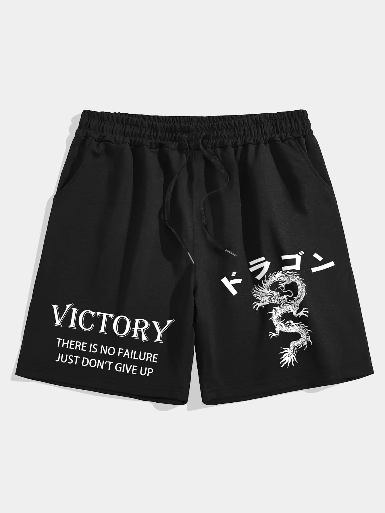 Hombres Shorts con letra japonesa & con estampado de dragón de cintura con cordón