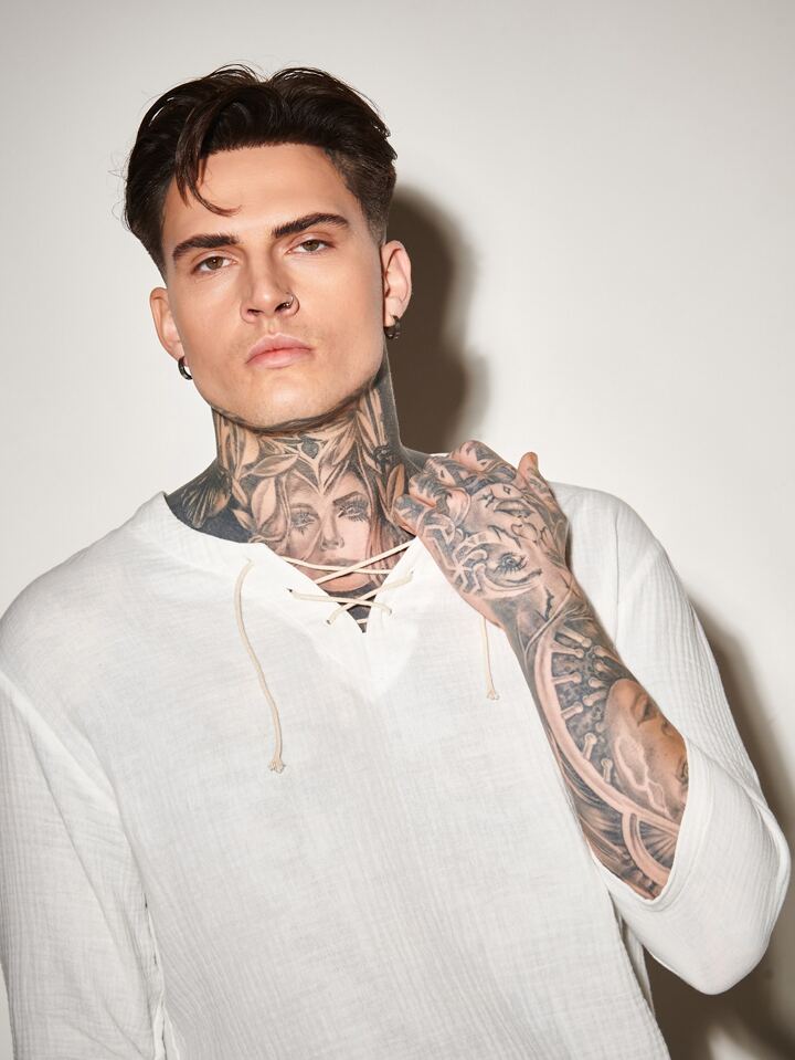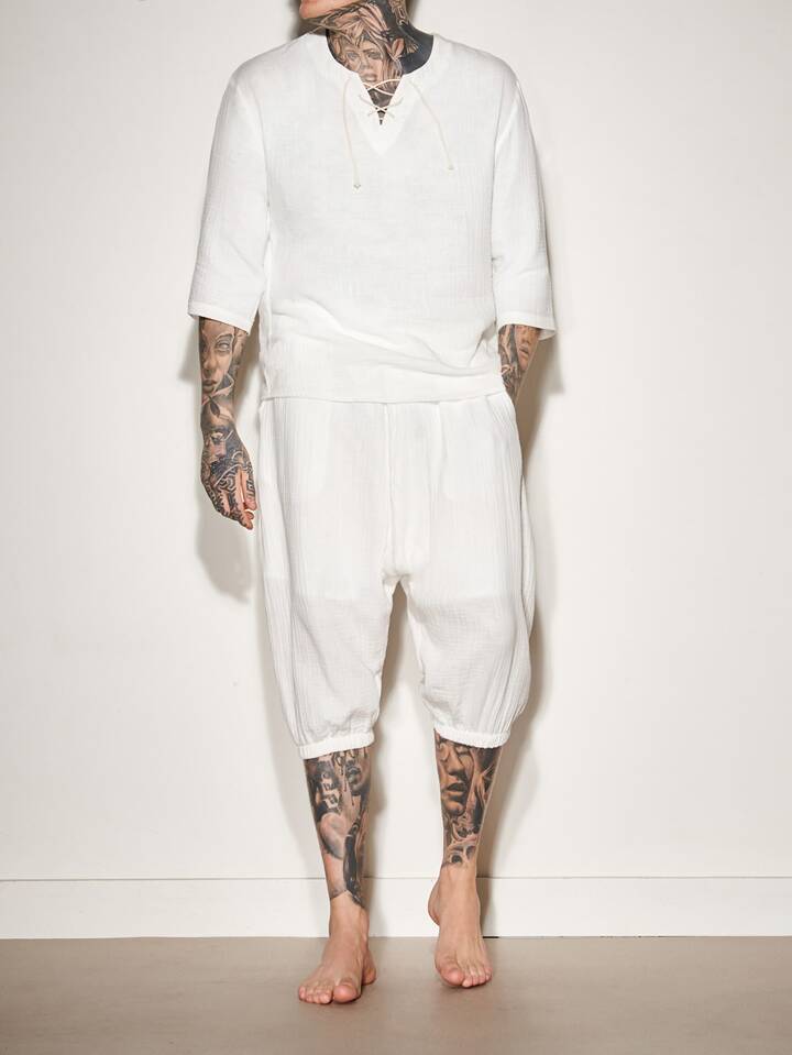 Blusa suelta de hombre de algodón con cuello con muesca y cordones frontales