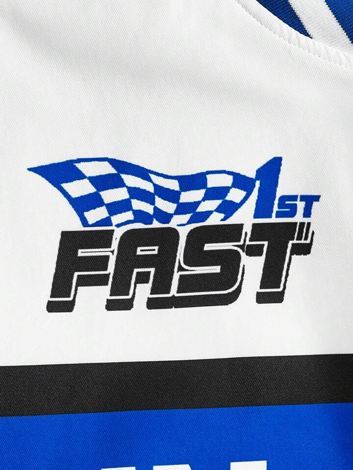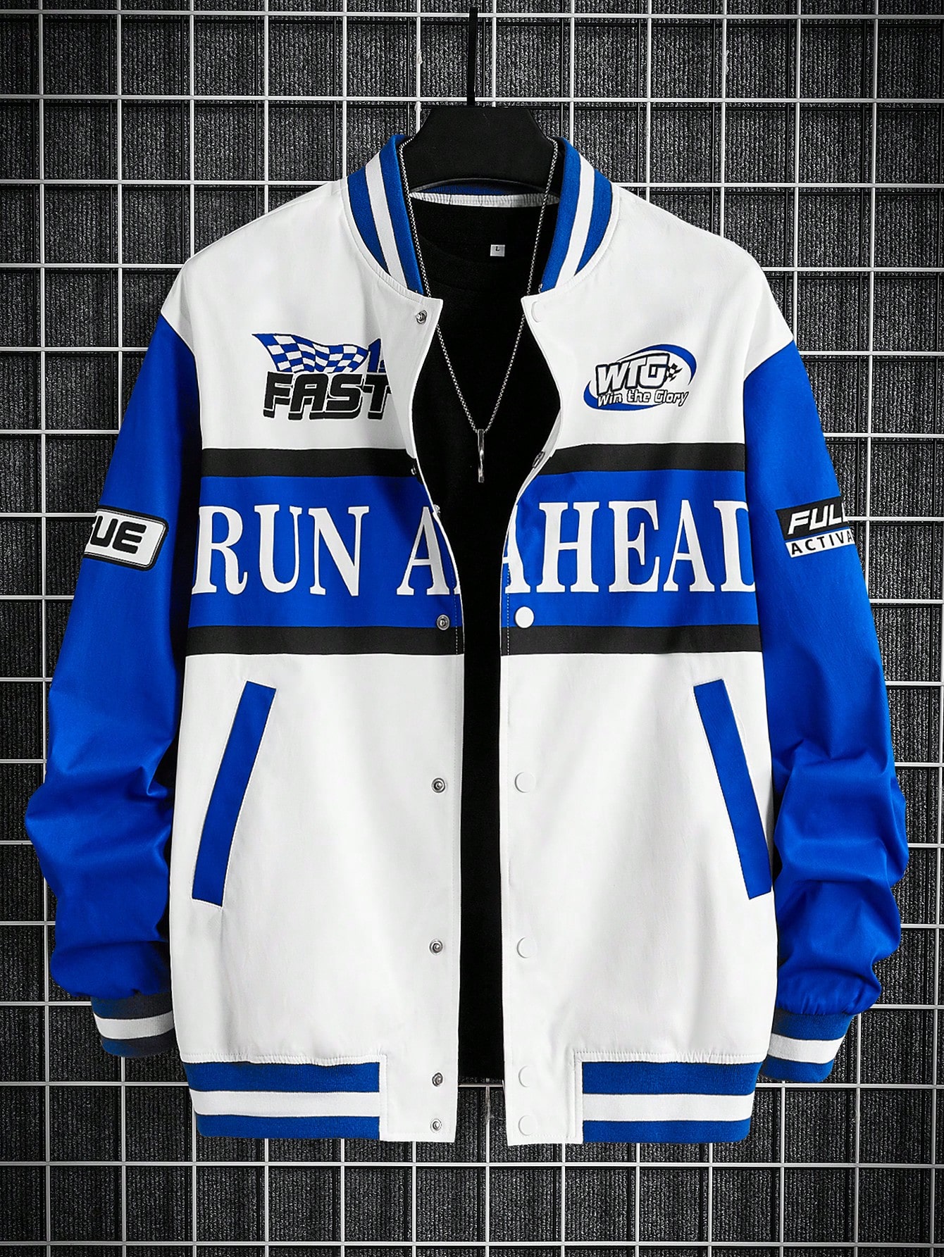 Chaqueta universitaria oversize con bloques de color, gráfico de letras y ribete a rayas de hombros caídos para hombre (sin camiseta)