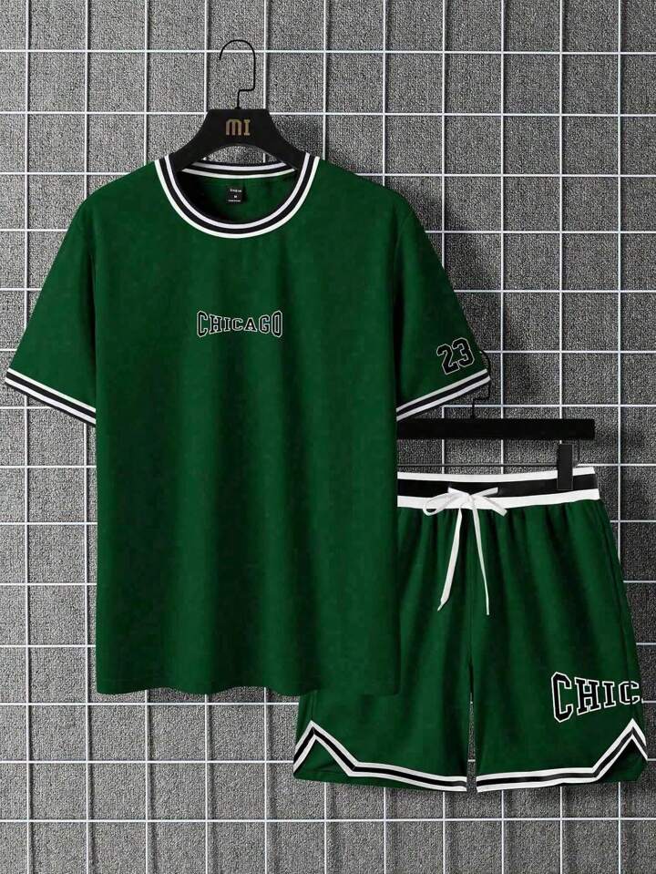 Hombres con estampado de letra ribete en contraste Camiseta & de cintura con cordón Shorts
