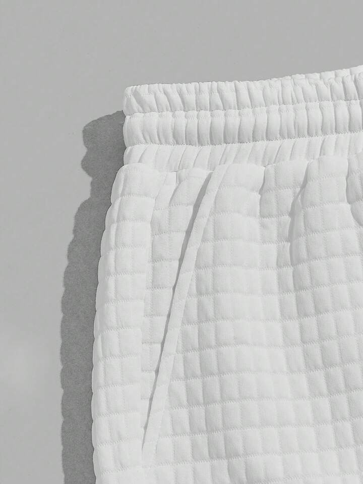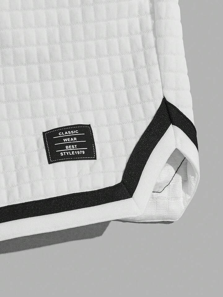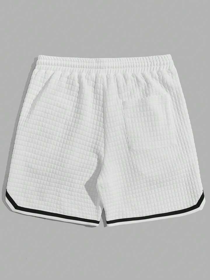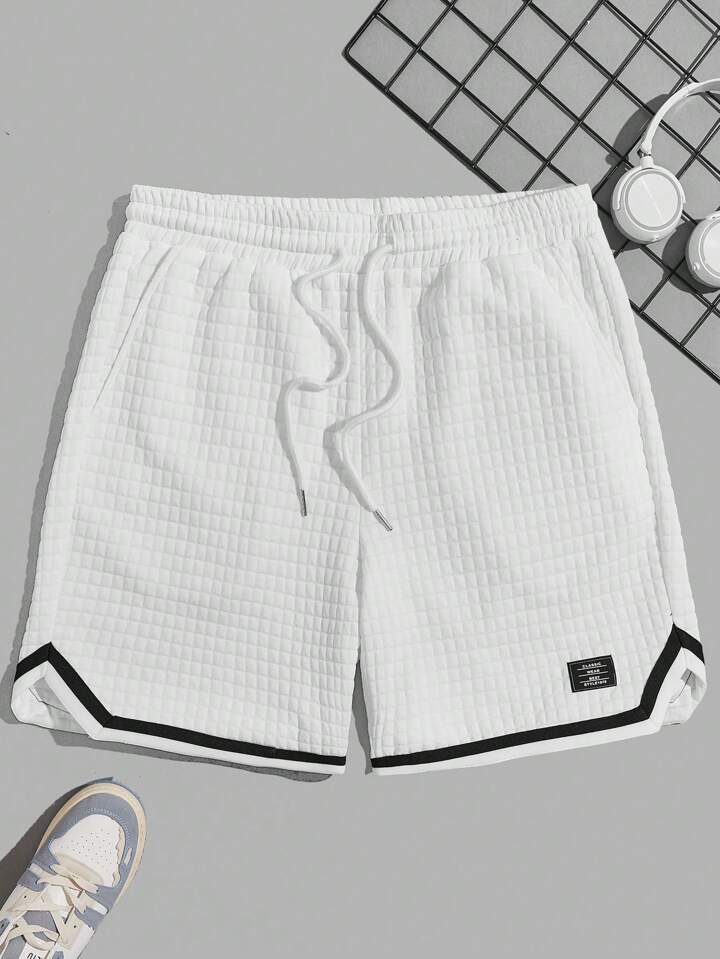 Shorts holgados de punto blanco con detalle con parche de letra, ribete de contraste y cordón en la cintura, para hombre. Adecuado como regalo para esposo, novio, uso escolar o streetwear.