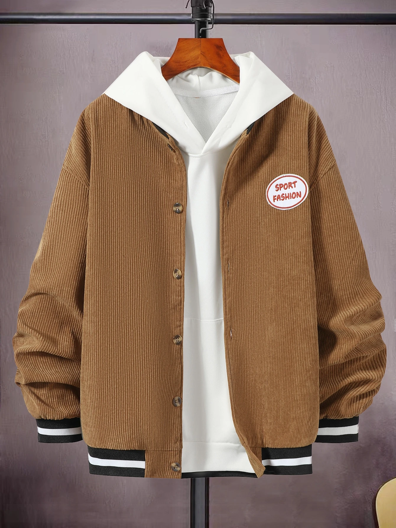Hombres Cazadora tipo bomber con parche de letra ribete de rayas de hombros caídos de pana sin capucha